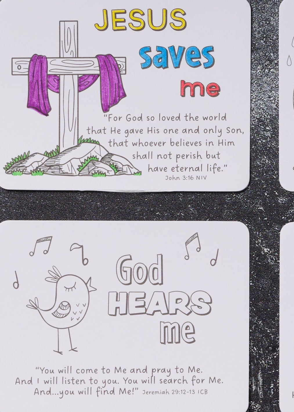44 cards made from heavy cardstock. Each card features a heartwarming, biblically based affirmation—showing children that they are loved, forgiven, saved, chosen, and strengthened by Jesus. These affirmations are supported by uplifting Scripture verses and paired with a fun line-art illustration, ready to be colored. The backs are intentionally left blank for children to add their own insights or drawings.