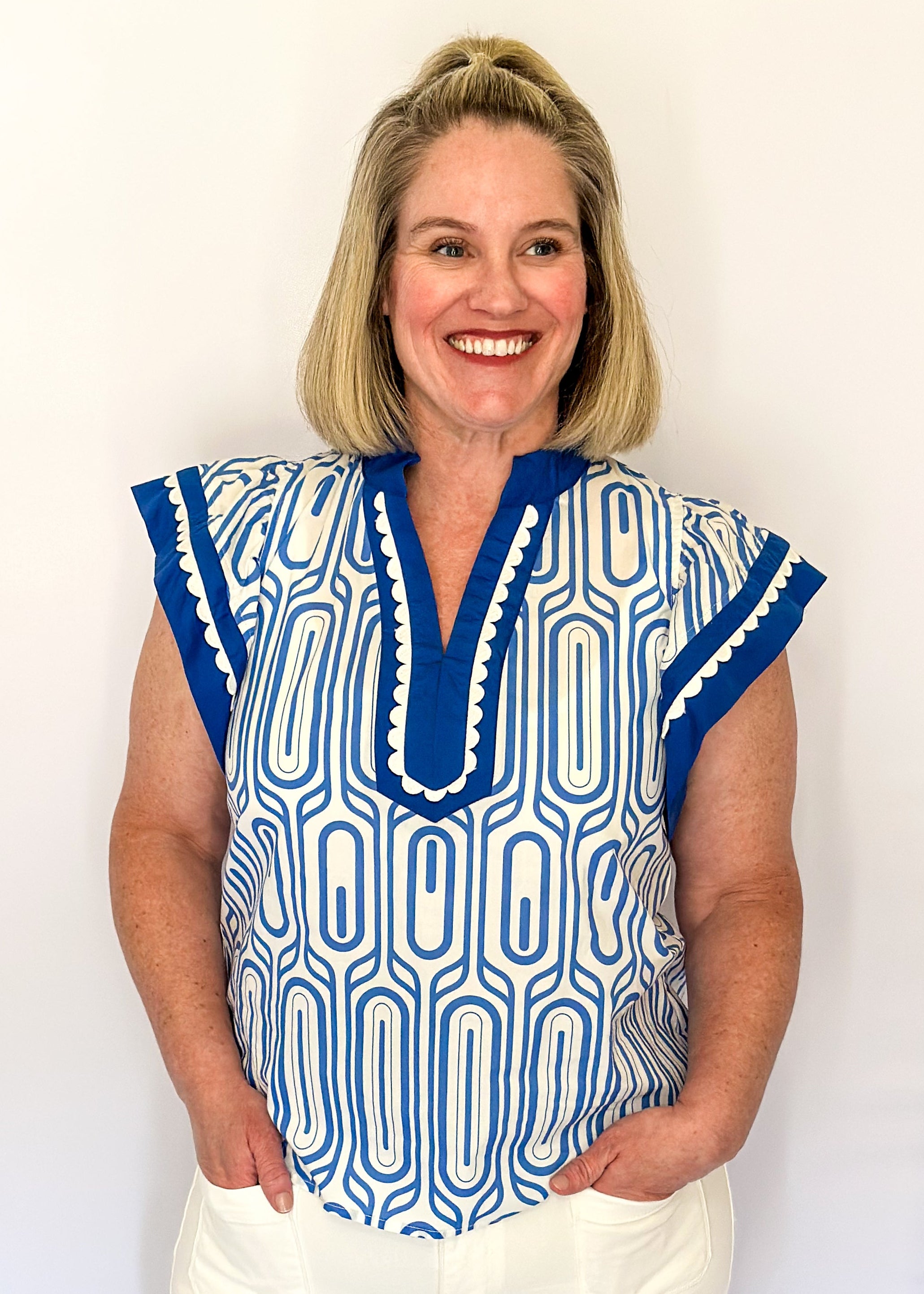 The bold pattern brings the personality on this one! Bold blue contrast trim and fun scallop sleeve details. She's polished without being fussy. Available in Blue and Mint.