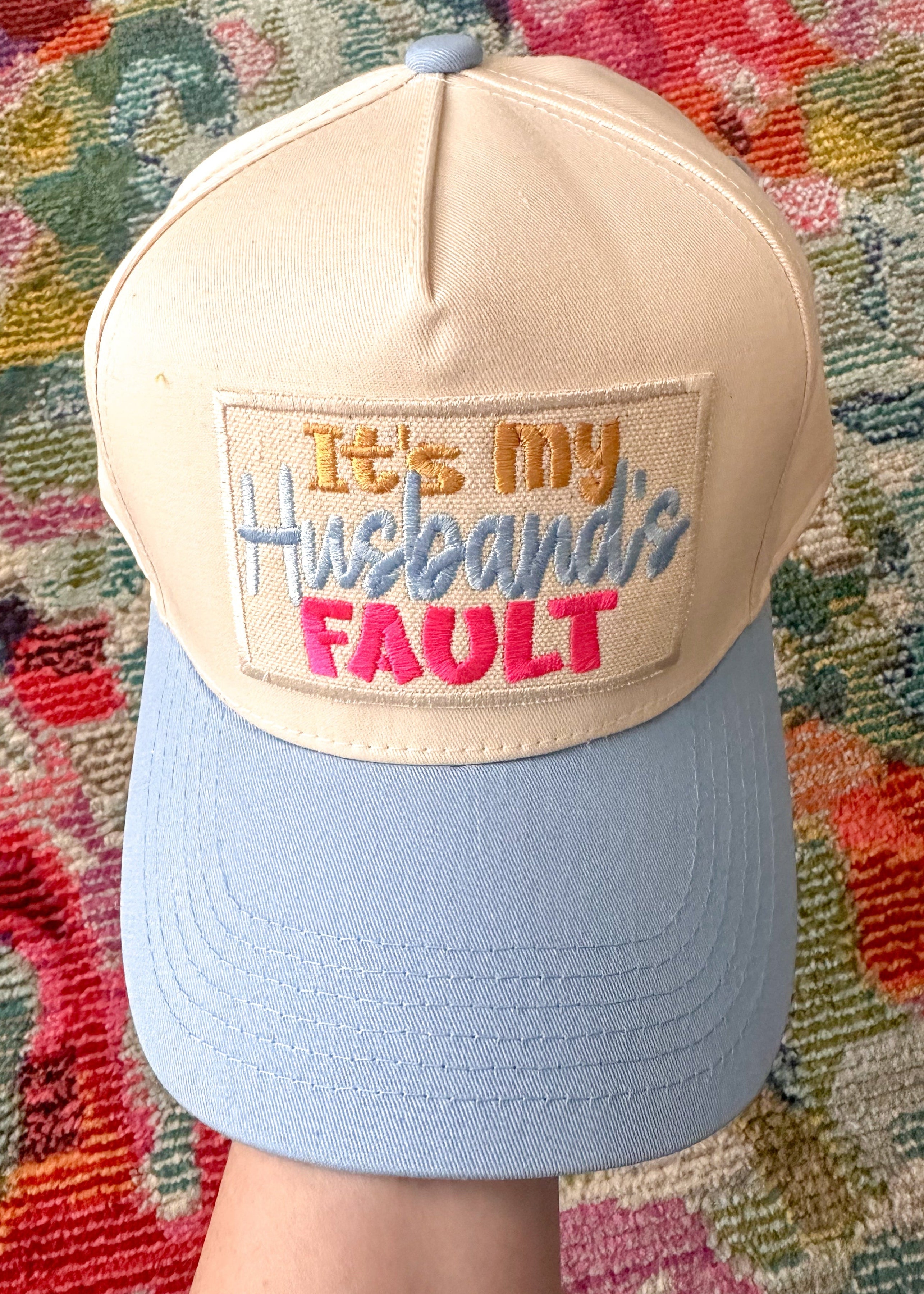 Soft tones, bold honesty. This snap back pairs feminine color blocking with a playful embroidered phrase that says what you’re already thinking. Easy to throw on, easy to laugh at, and easy to blame him.