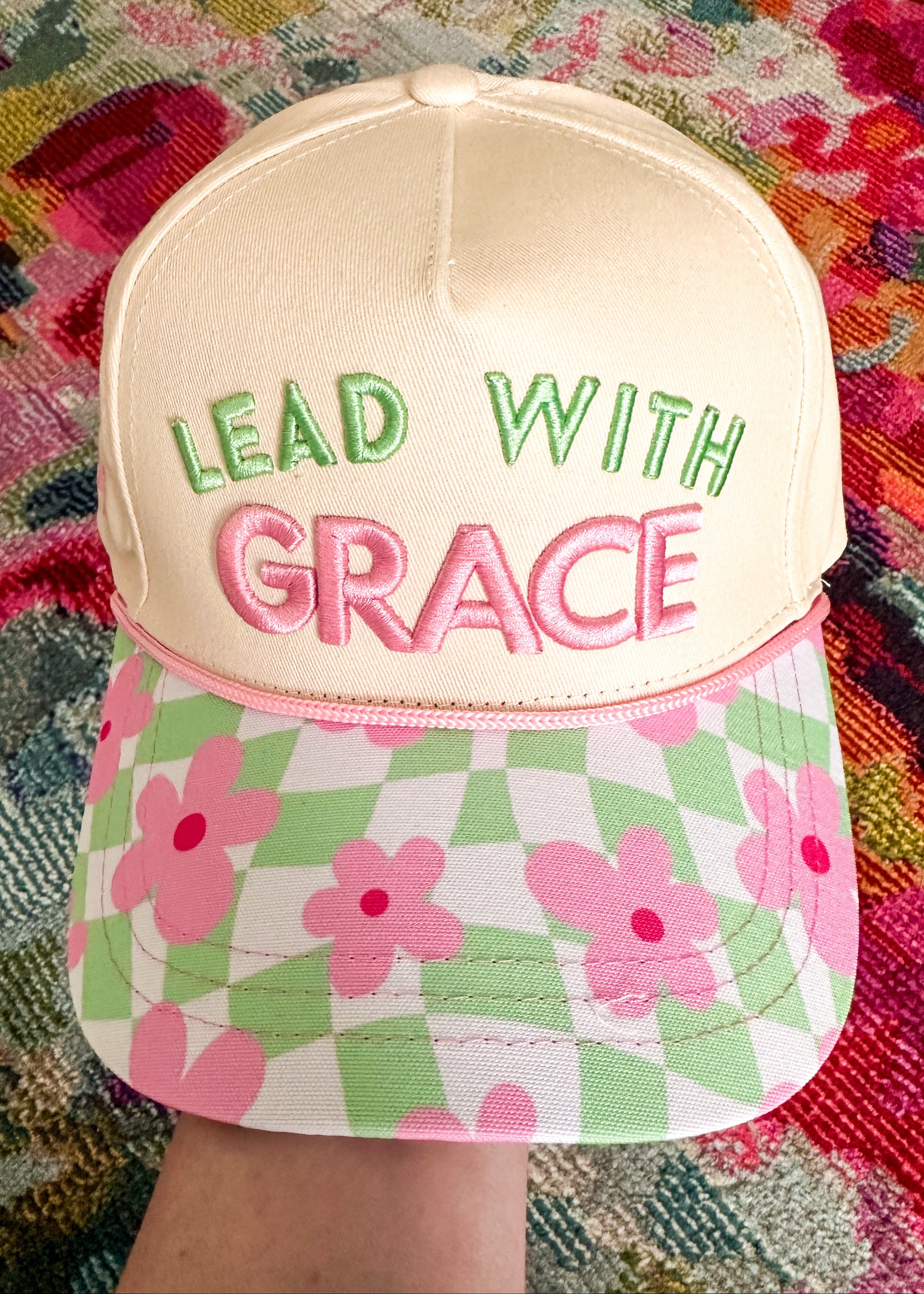 On the days when patience is thin and grace feels hard put this hat on. The cheerful floral brim and softly embroidered message are basically a hug for your head. Lead with grace, girl. You've got this!