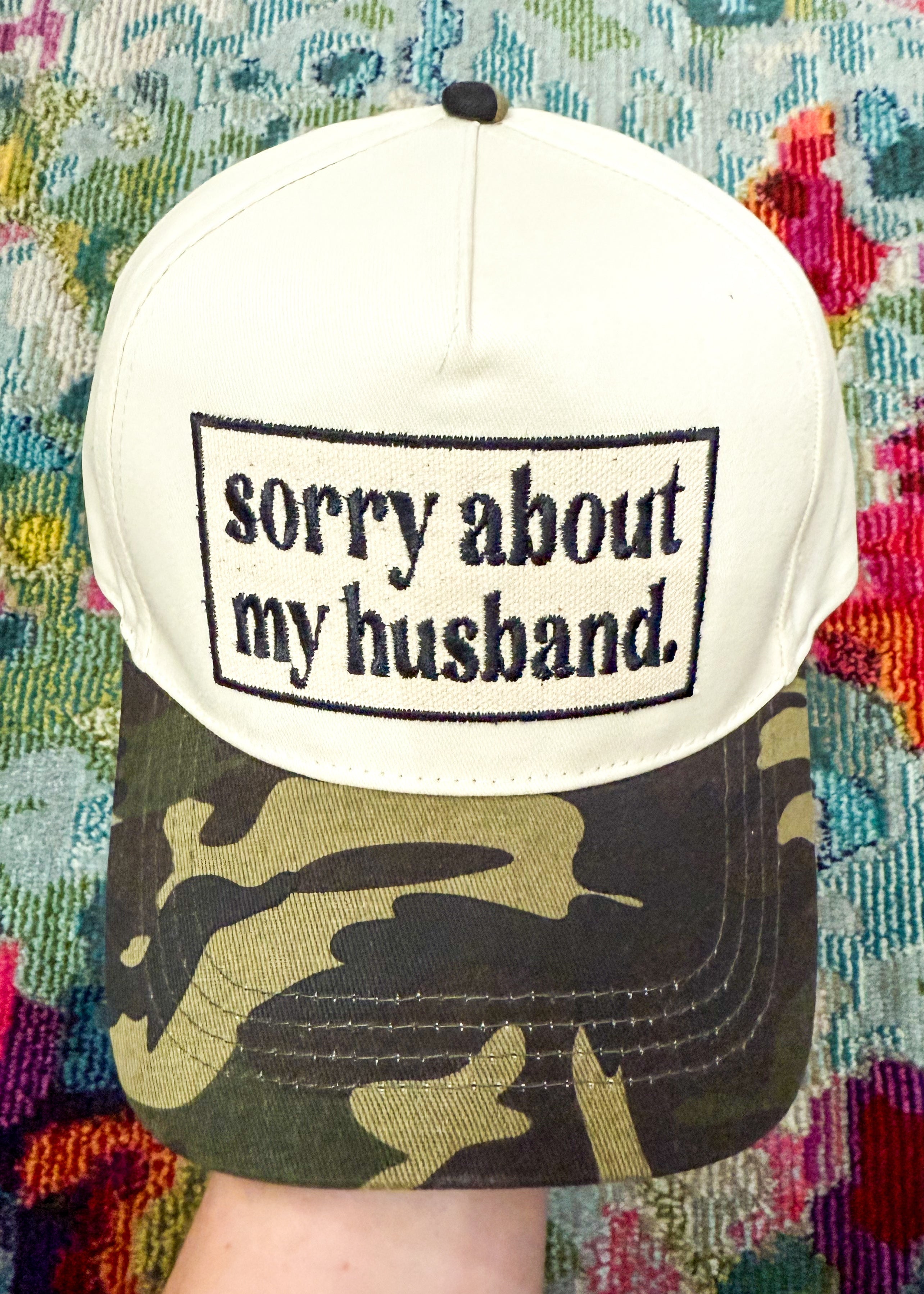 Sorry About My Husband Hat - Canvas and Black with Camo Bill