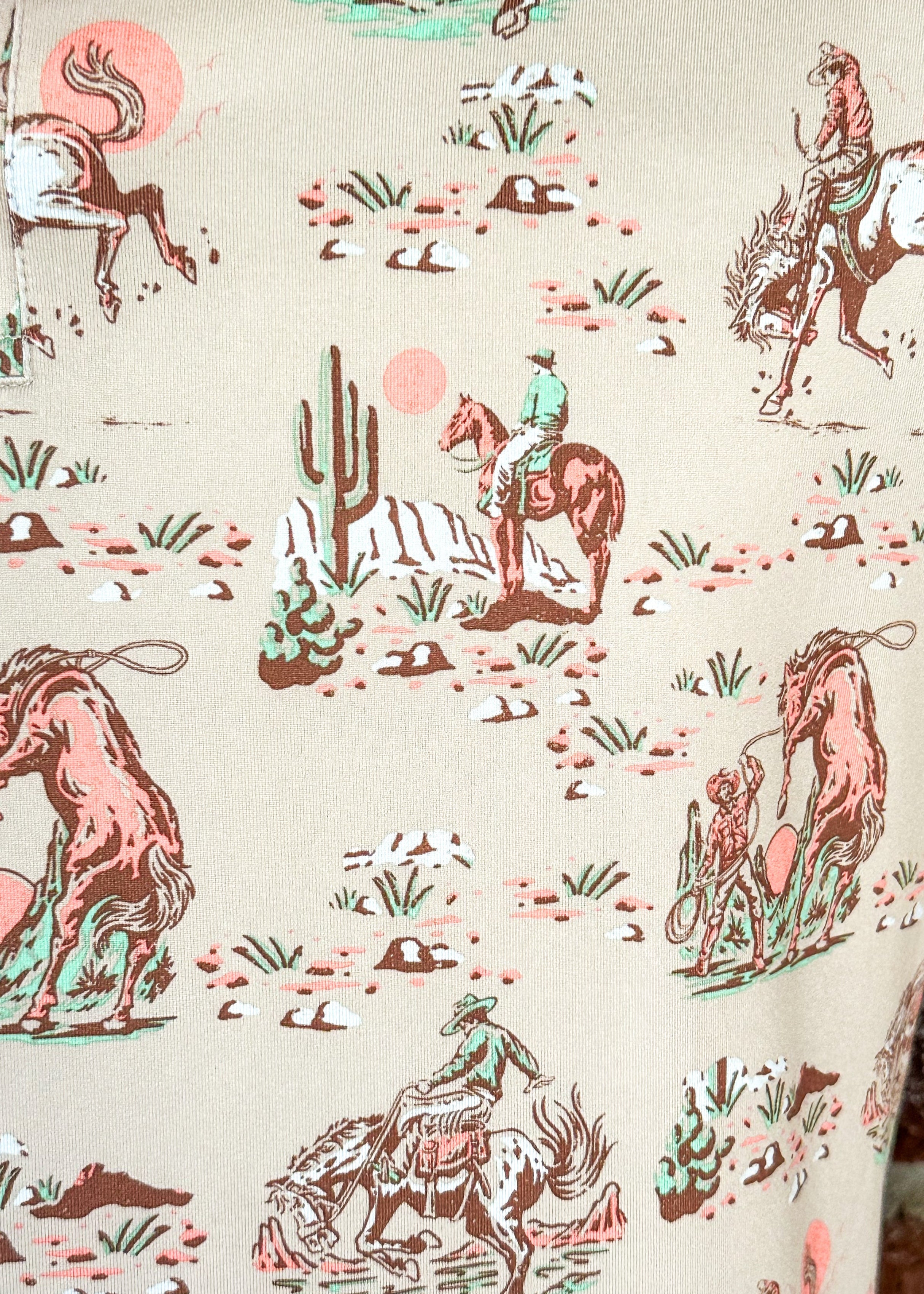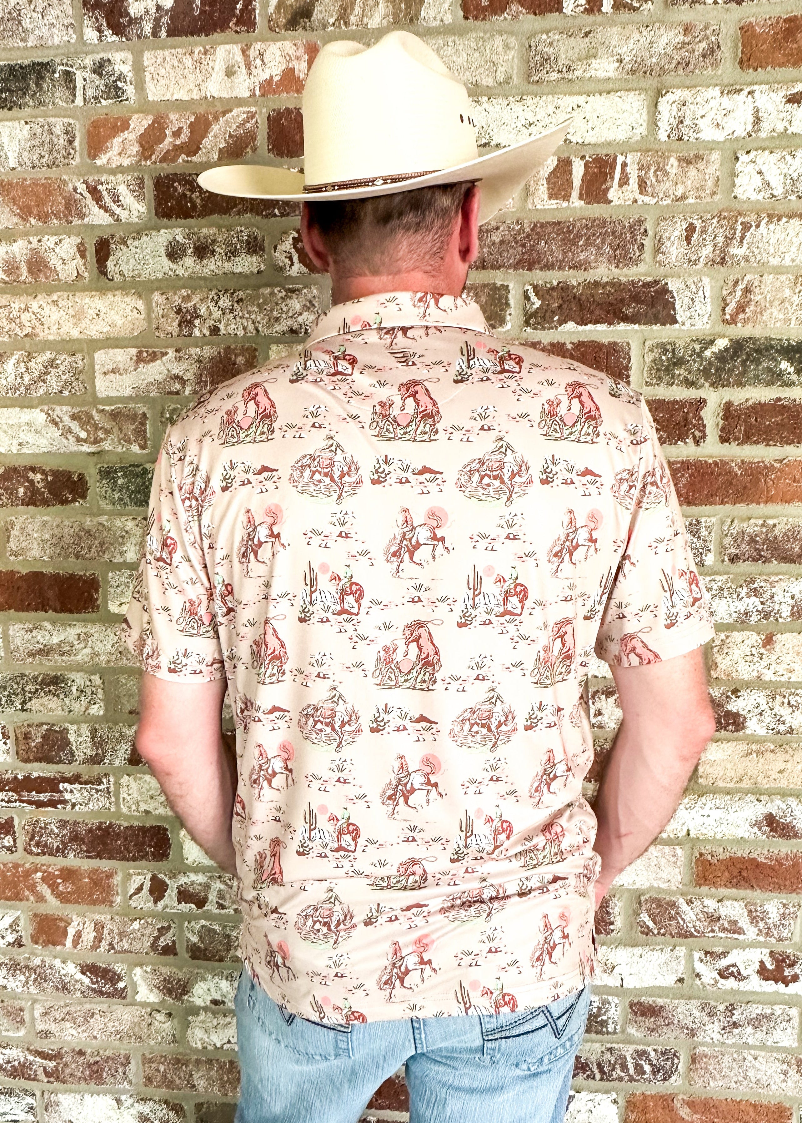 Work hard, play harder. This performance polo features a lightweight, breathable fabric with a western-inspired ranch print. Perfect for long days outdoors, golf rounds, or backyard barbecues where comfort meets character.