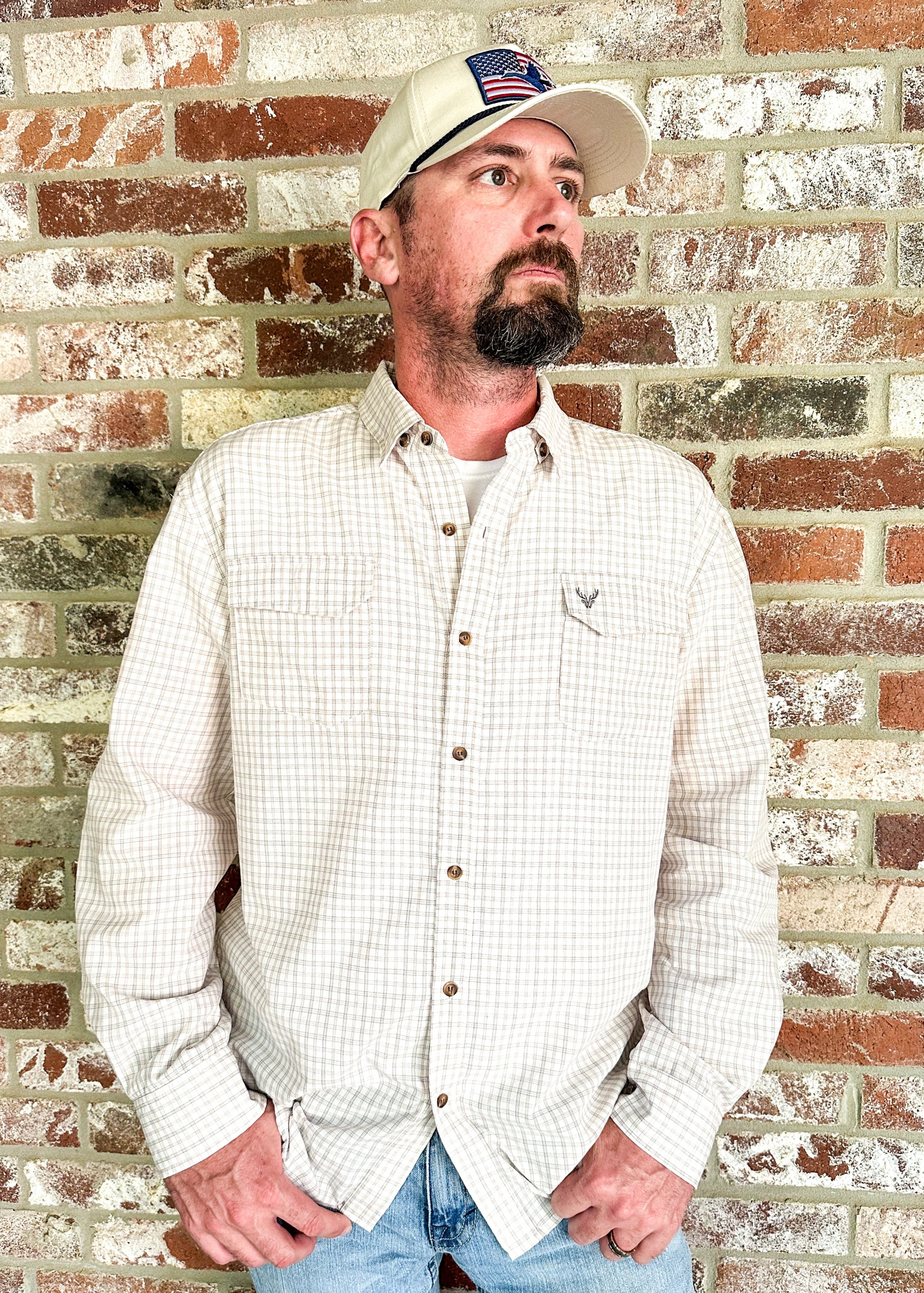 Adventure-ready with a side of everyday style. Featuring a neutral plaid print, long sleeves, and chest embroidery, this shirt is versatile enough for a night out or a morning hunt.