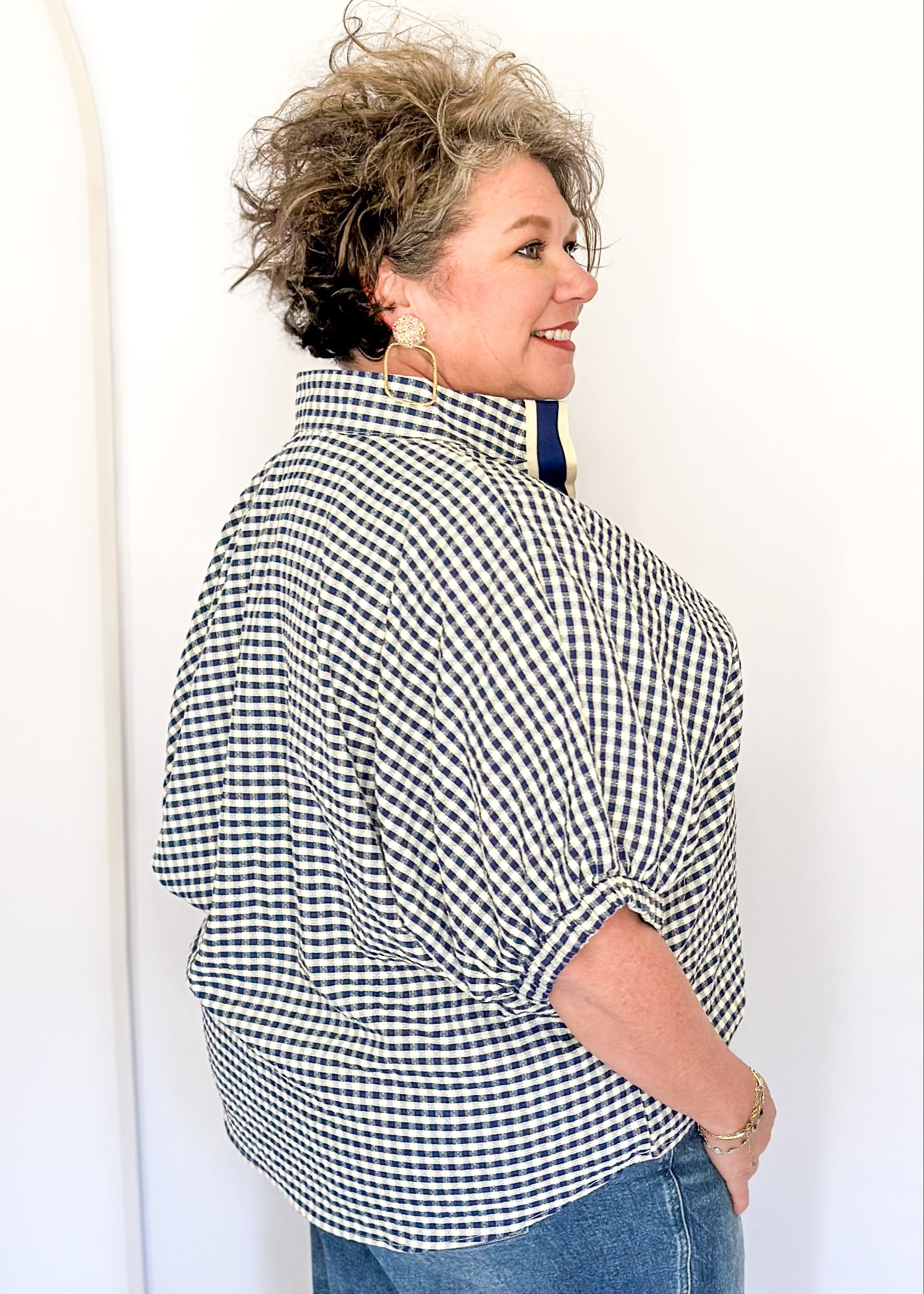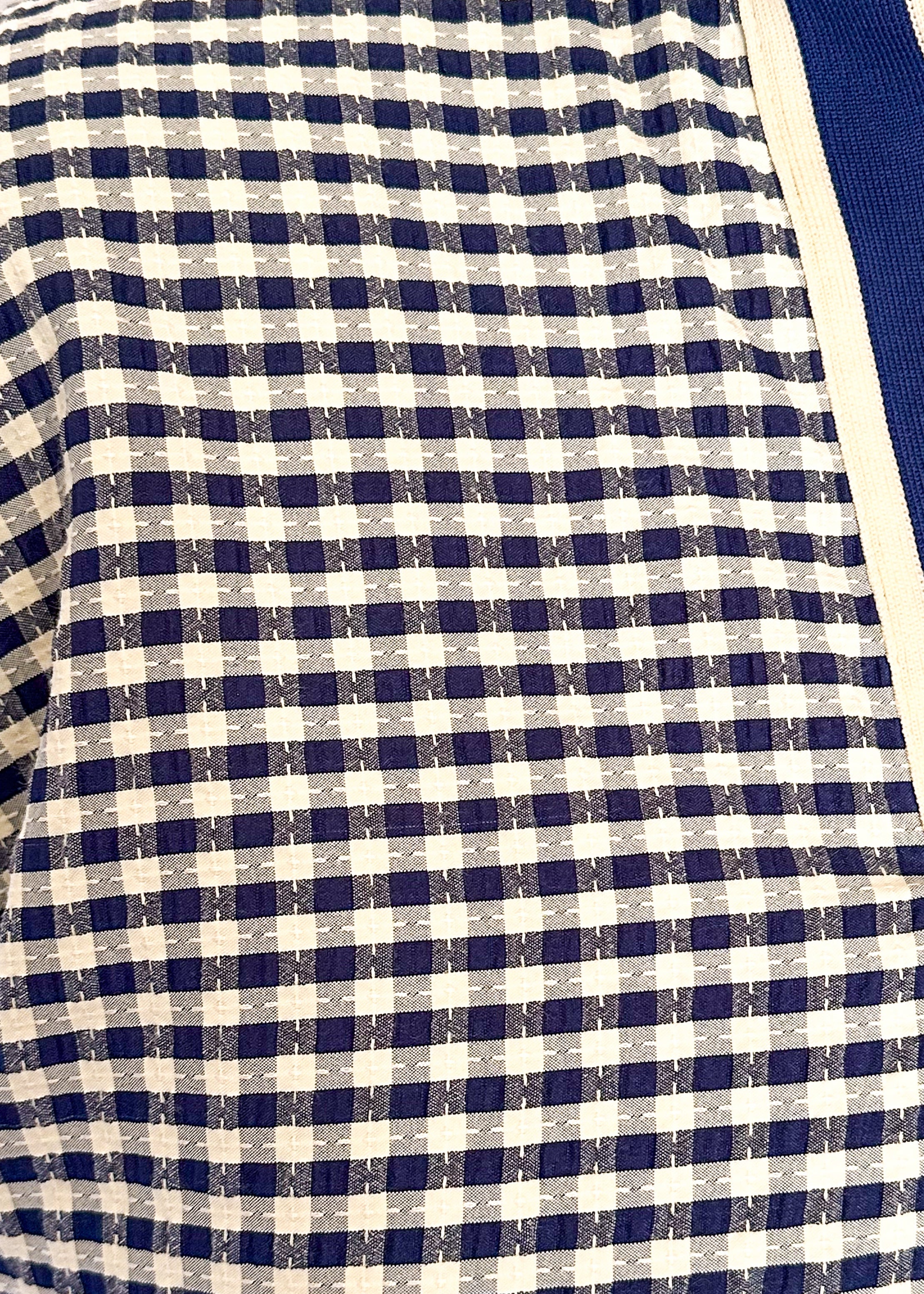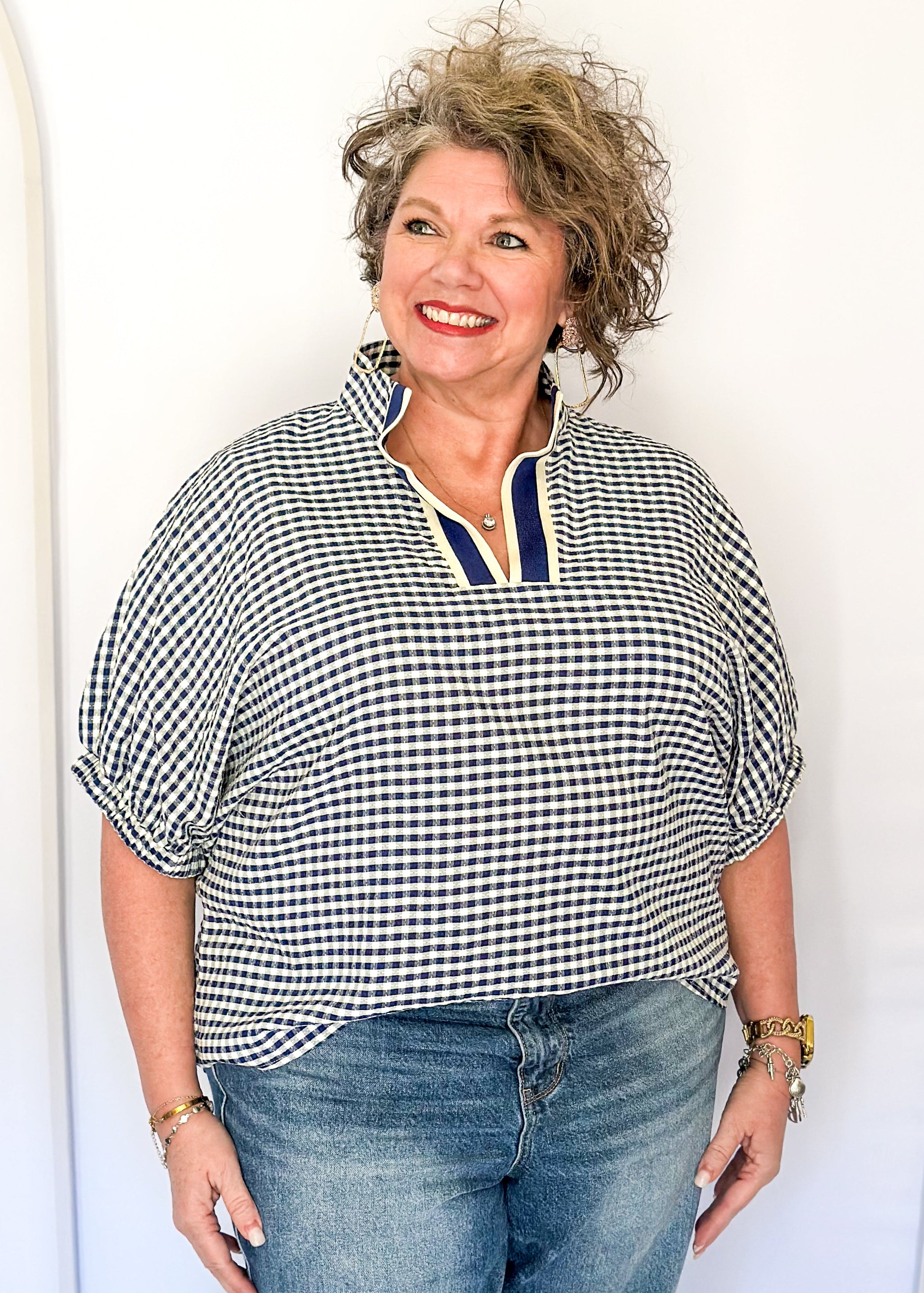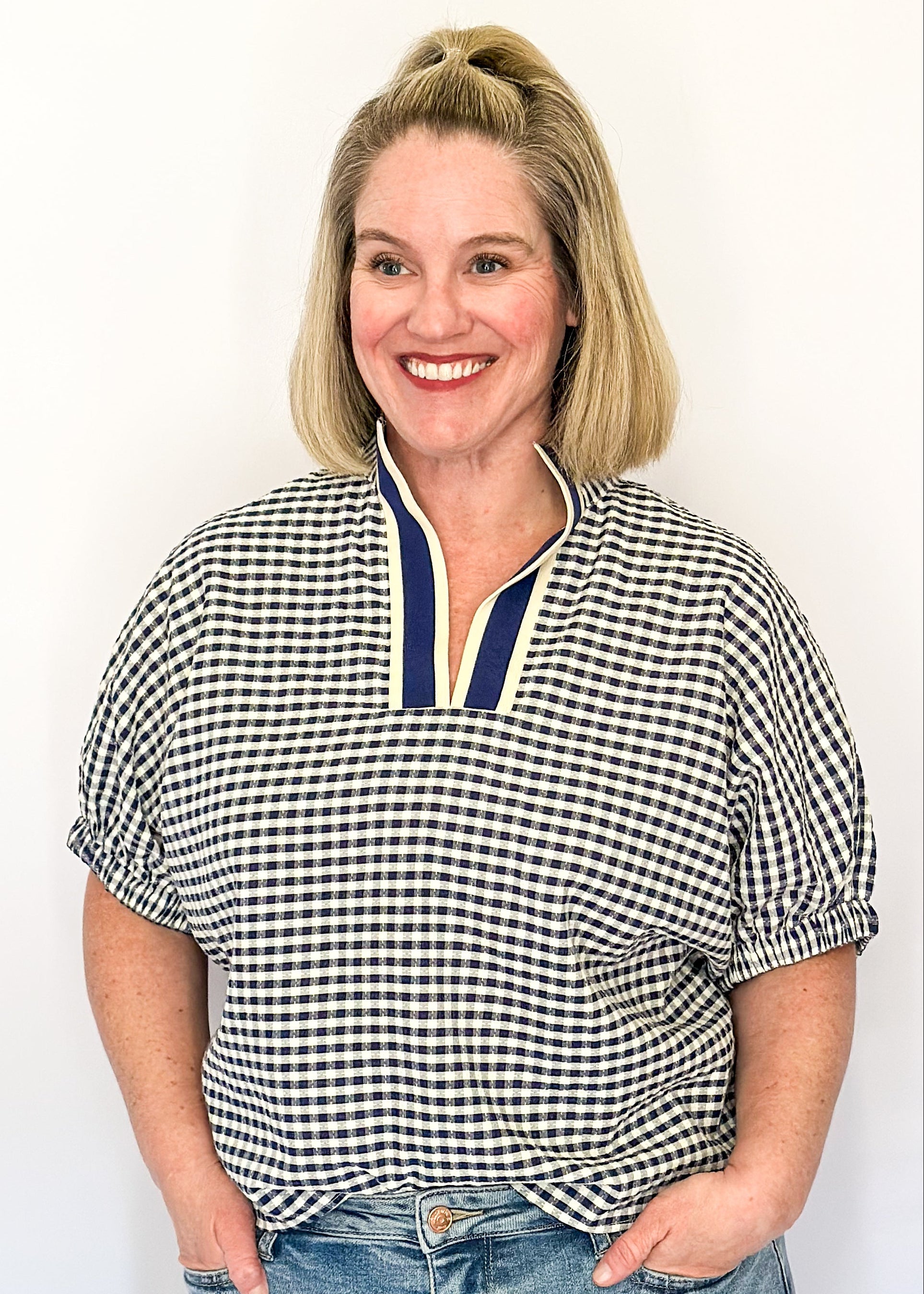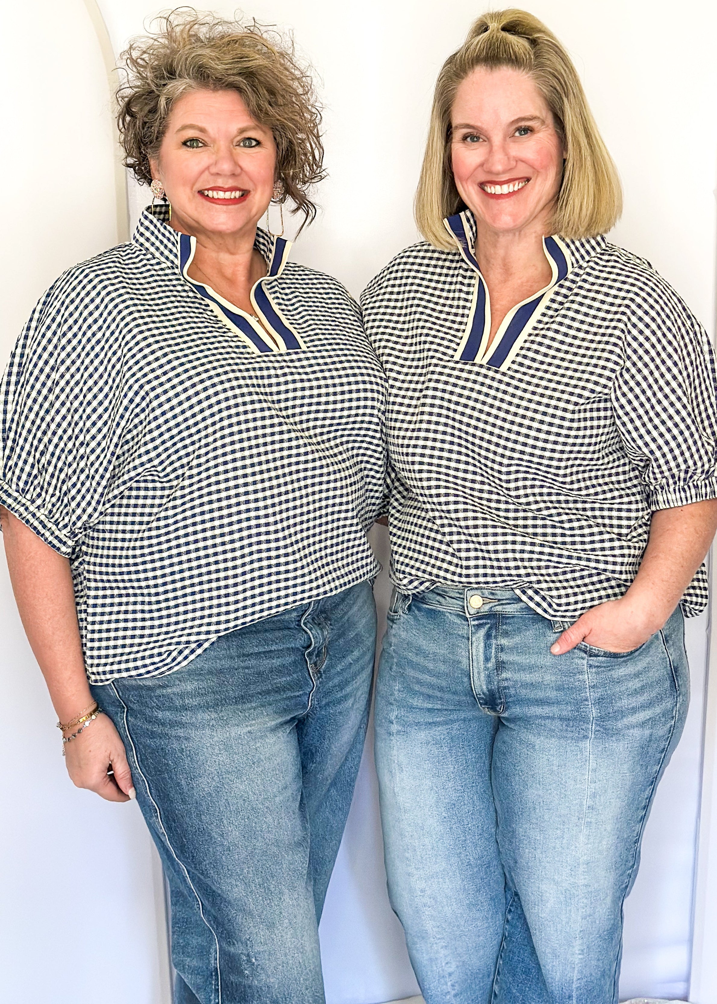 This top understood the assignment. Classic navy checks, crisp off white stitching, and a relaxed fit that doesn’t cling where it shouldn’t. It’s polished enough to look intentional and comfy enough to wear all day. Throw it on with your favorite blue jeans and you are ready for whatever the day brings.