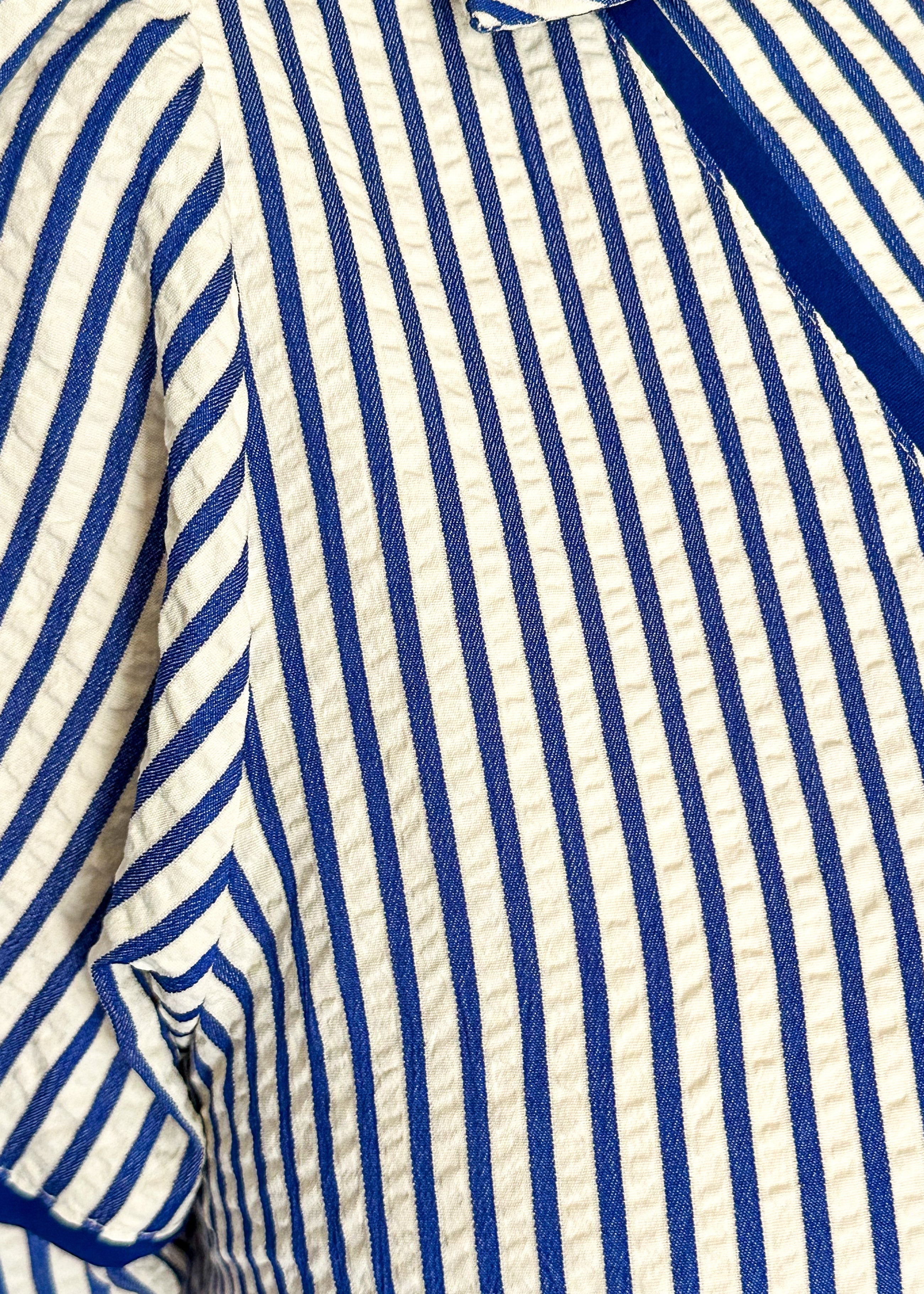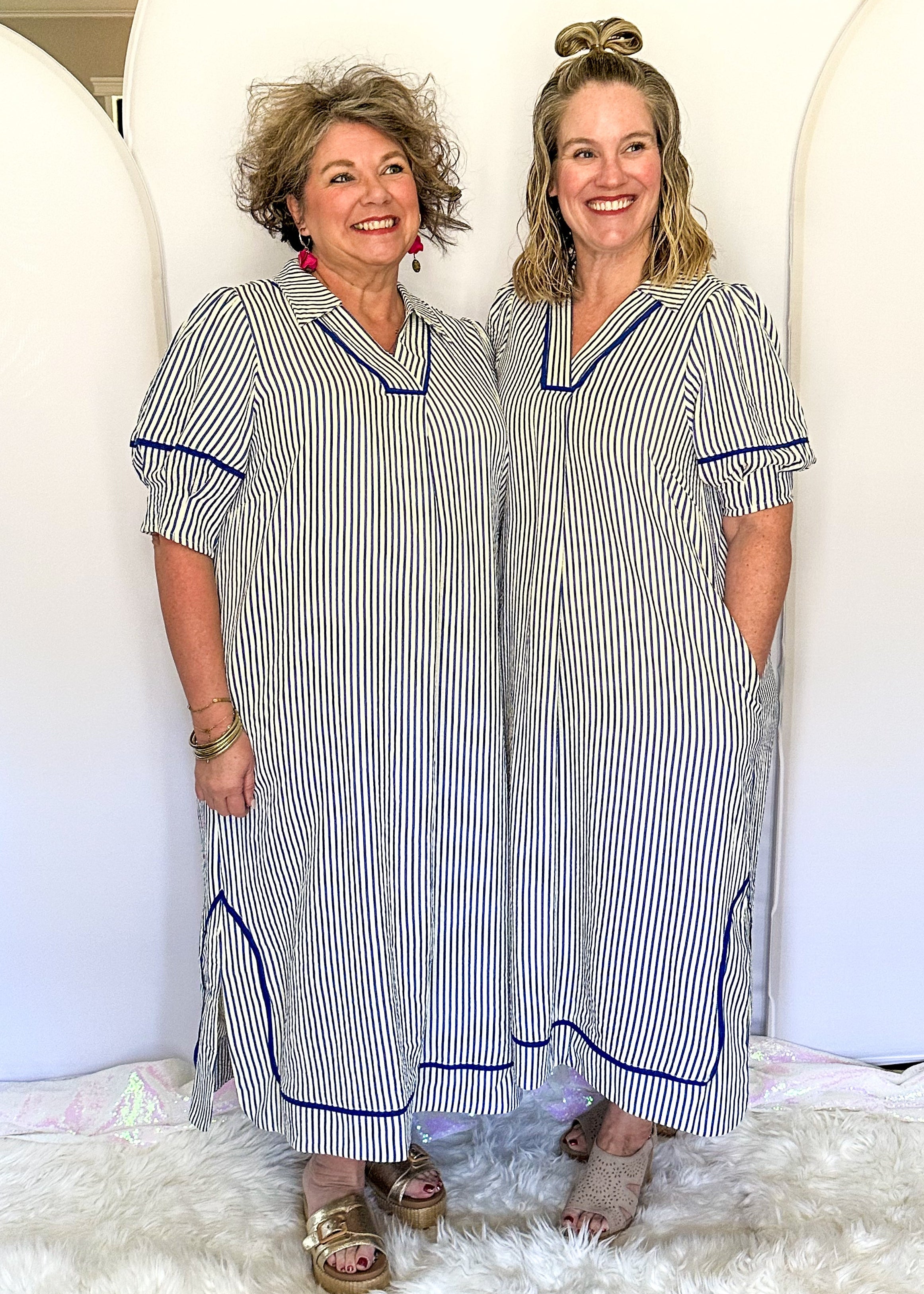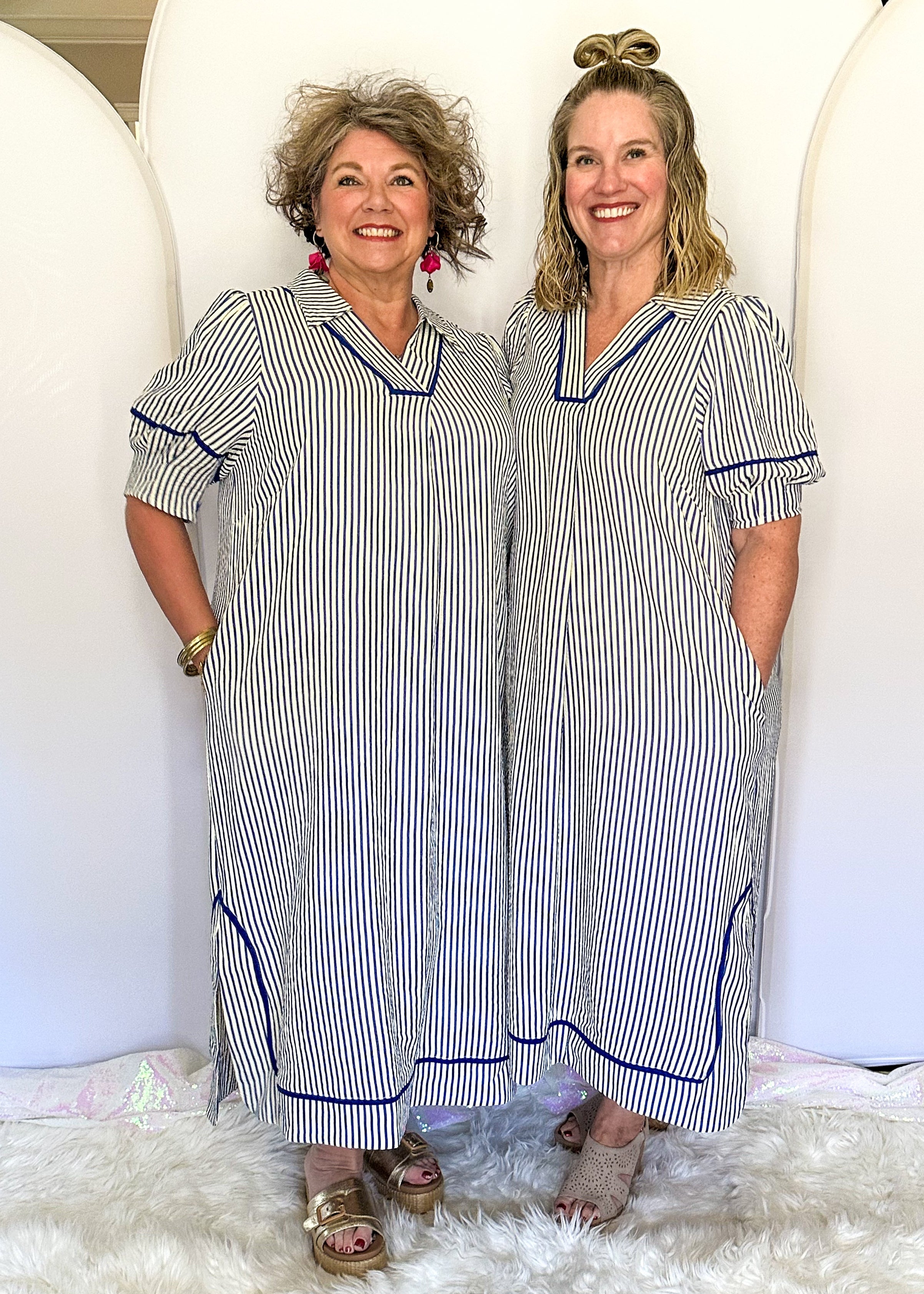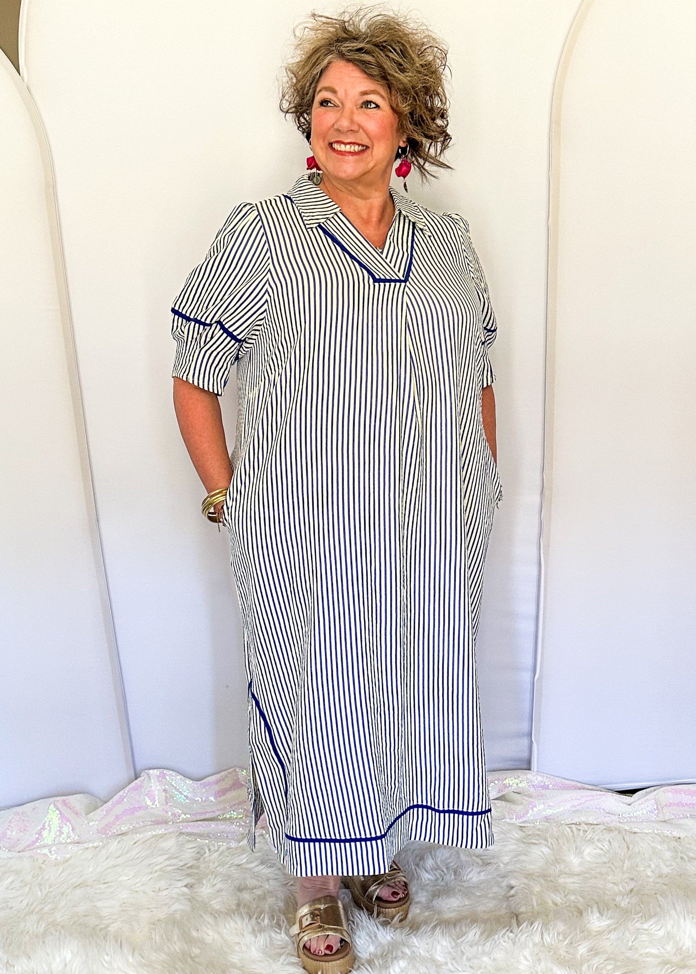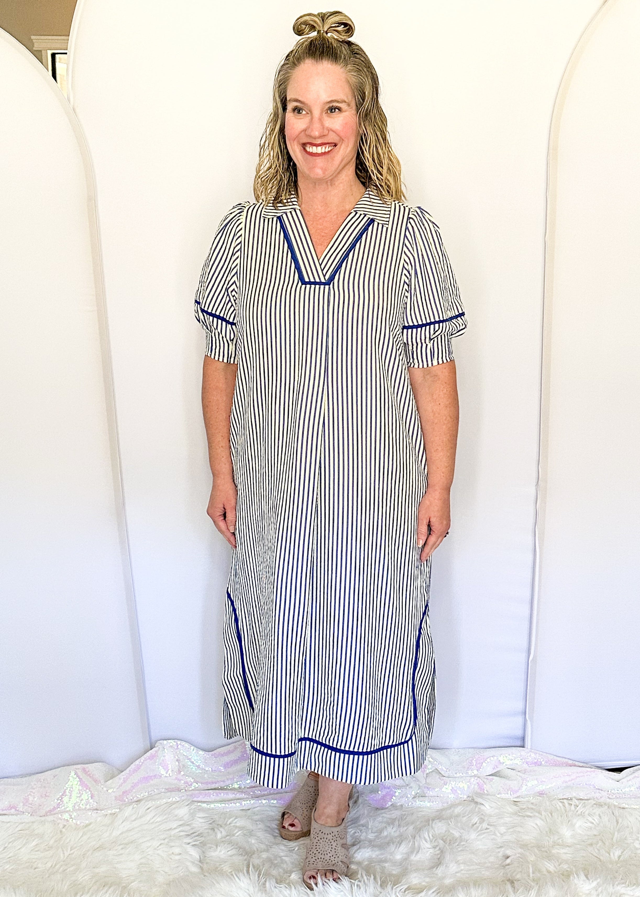 Lightweight, flowy, and ready for warm days ahead. This striped midi dress features a relaxed fit, short sleeves, a split V-neckline with contrast trim, and pockets (because obviously). It’s the kind of dress you throw on and instantly feel put together — no overthinking required.