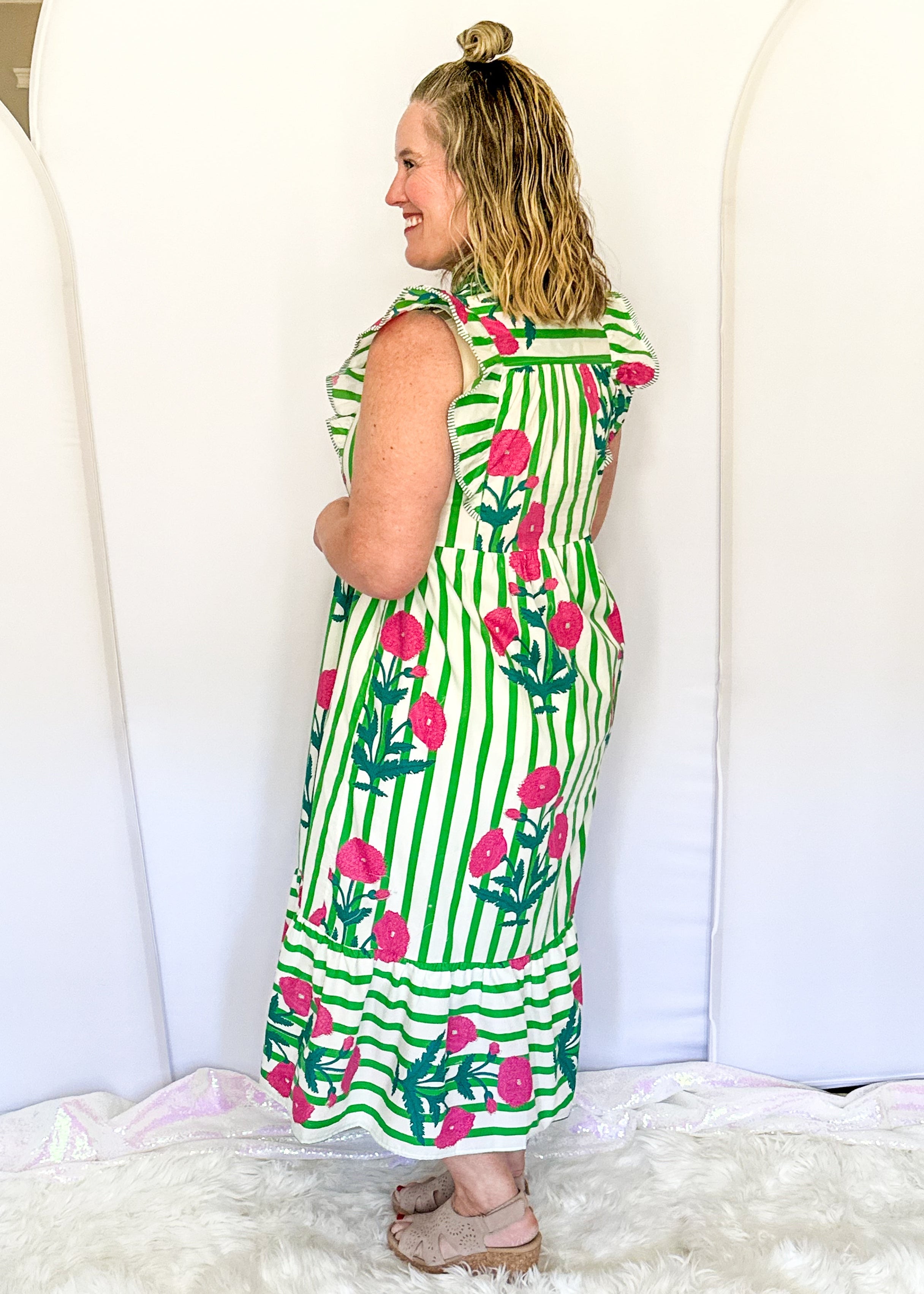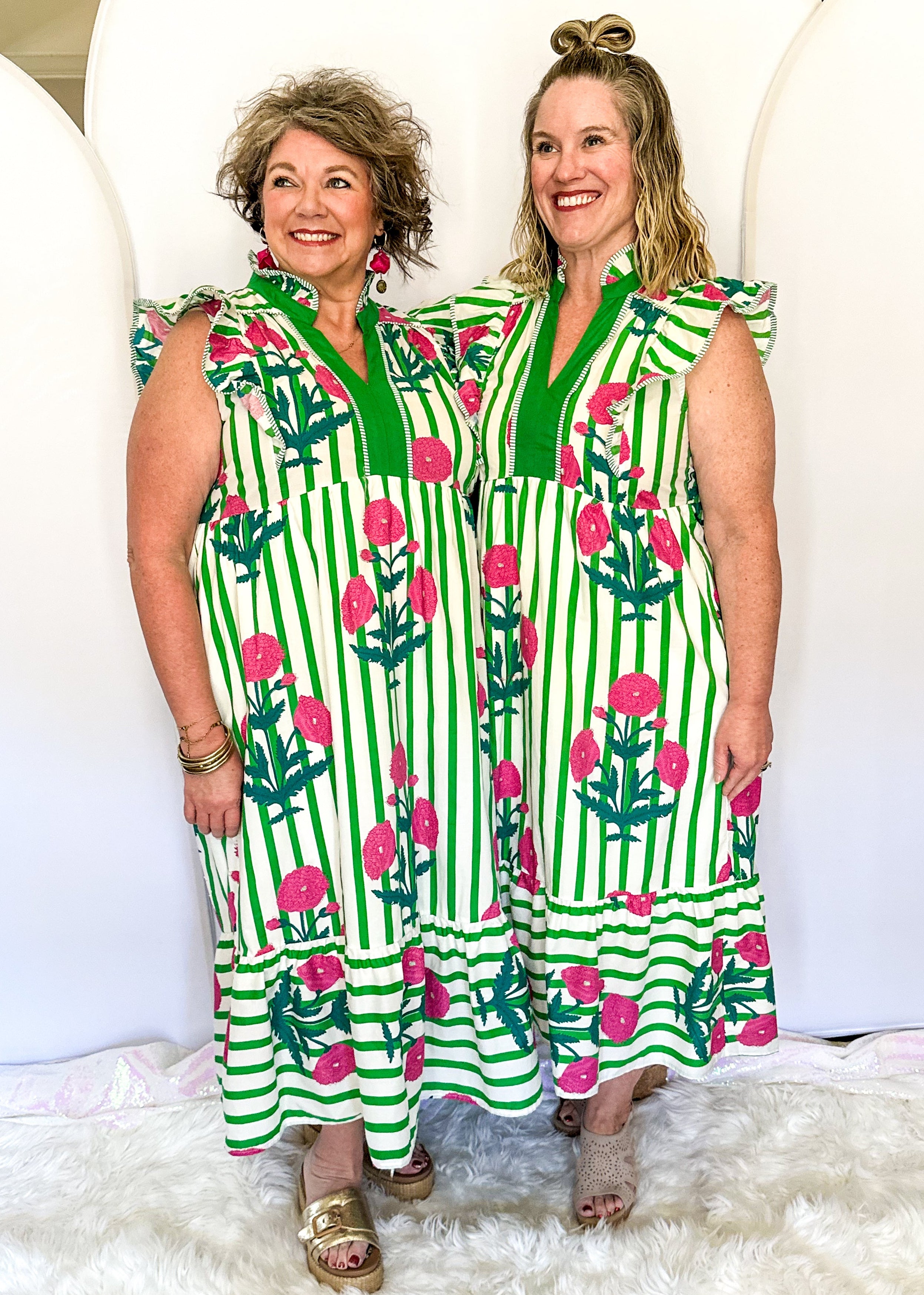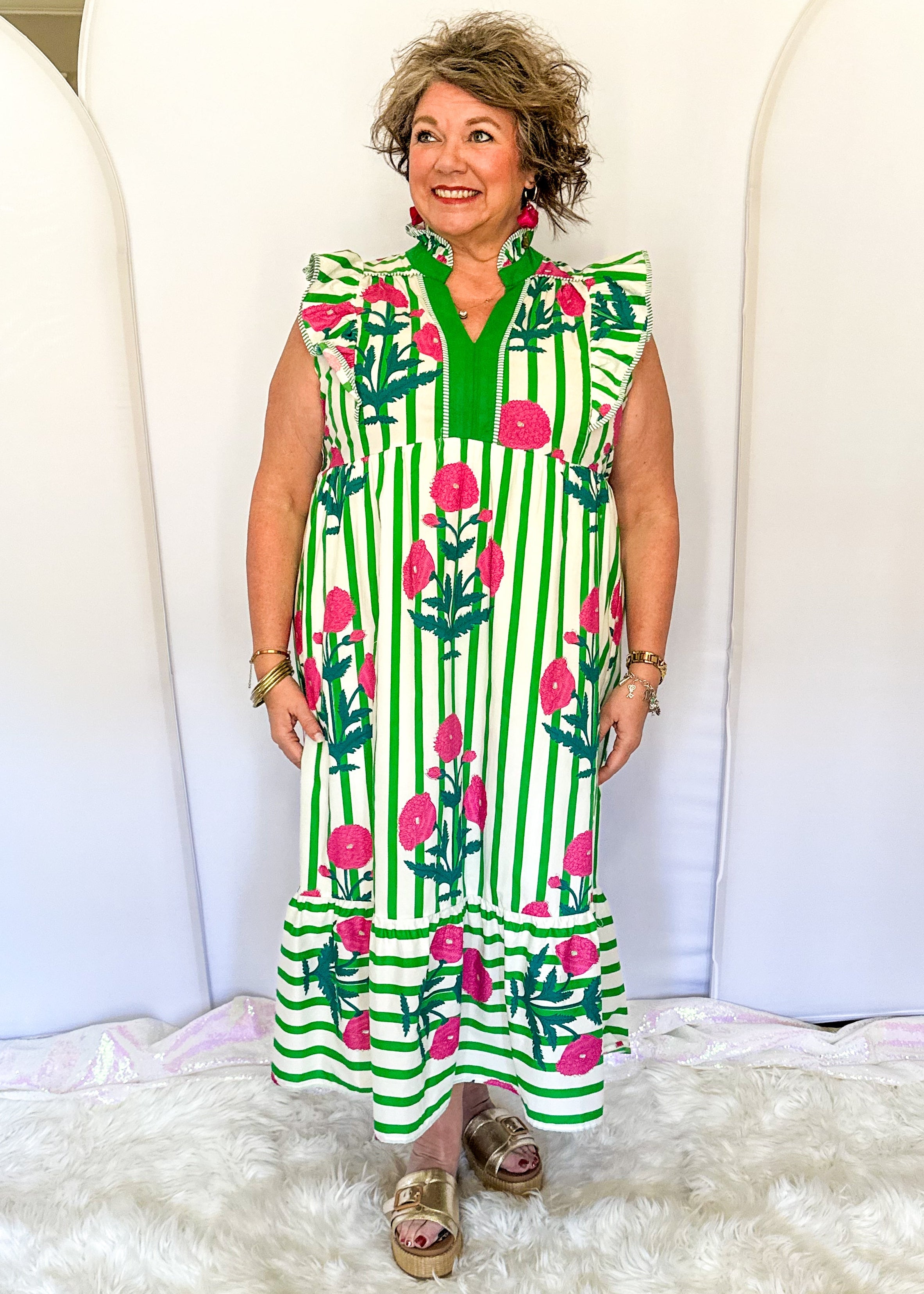 Fresh, fun, and impossible not to notice. This green floral stripe midi dress features a flattering striped pattern, playful flutter sleeves, and a contrast V-neckline that pulls the whole look together. It’s lightweight, comfortable, and perfect for spring days when you want to feel cute, confident, and very much put together.