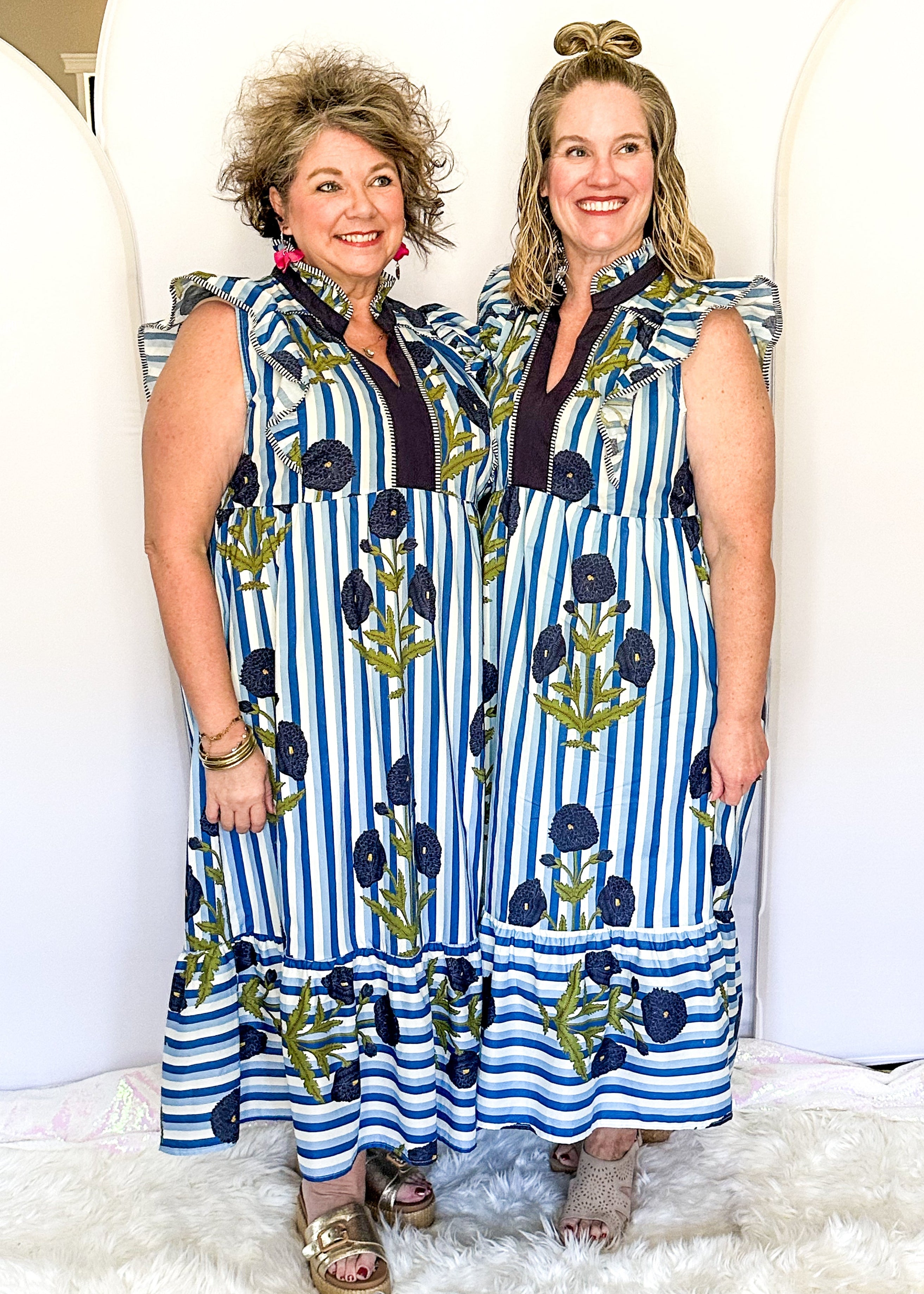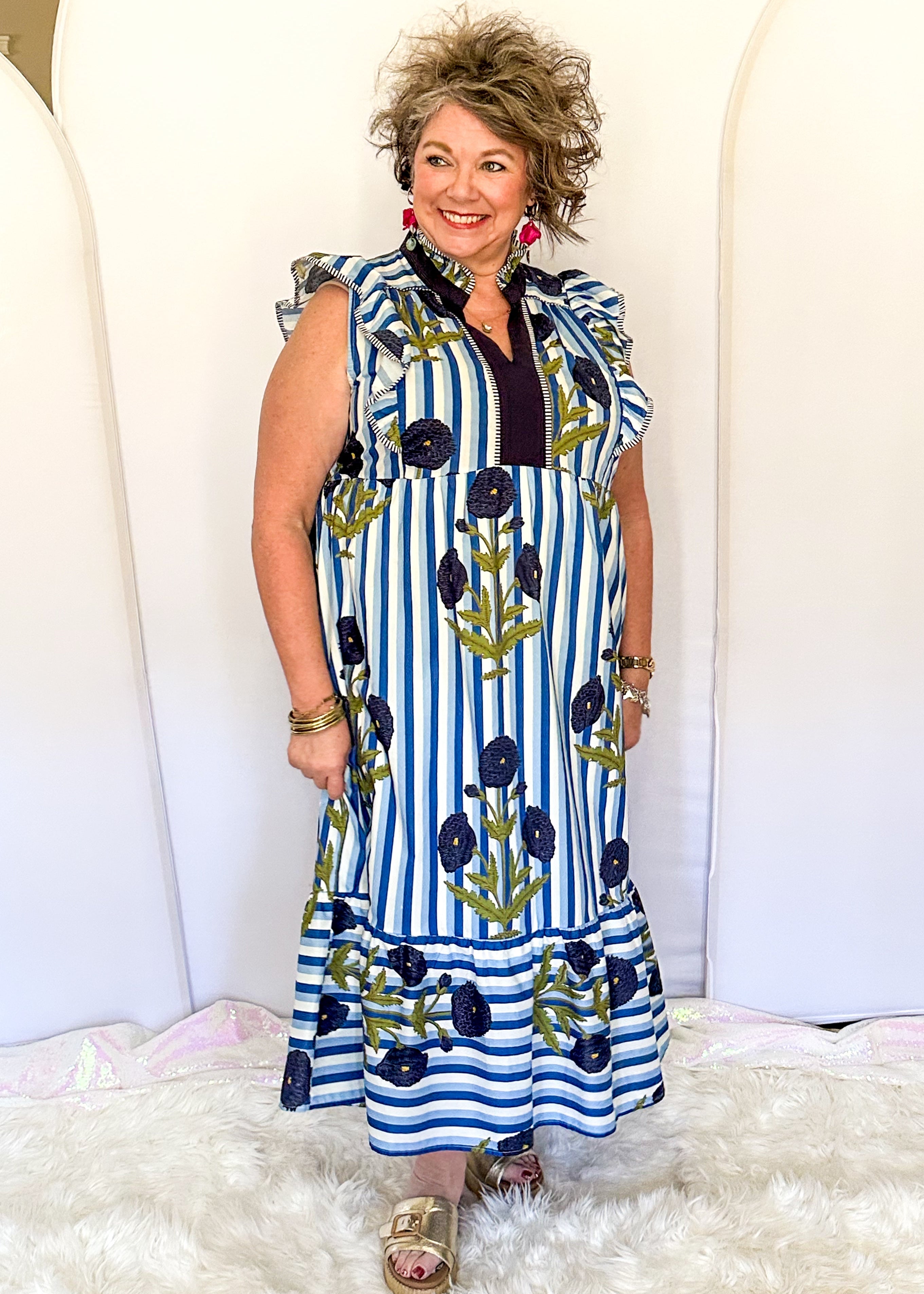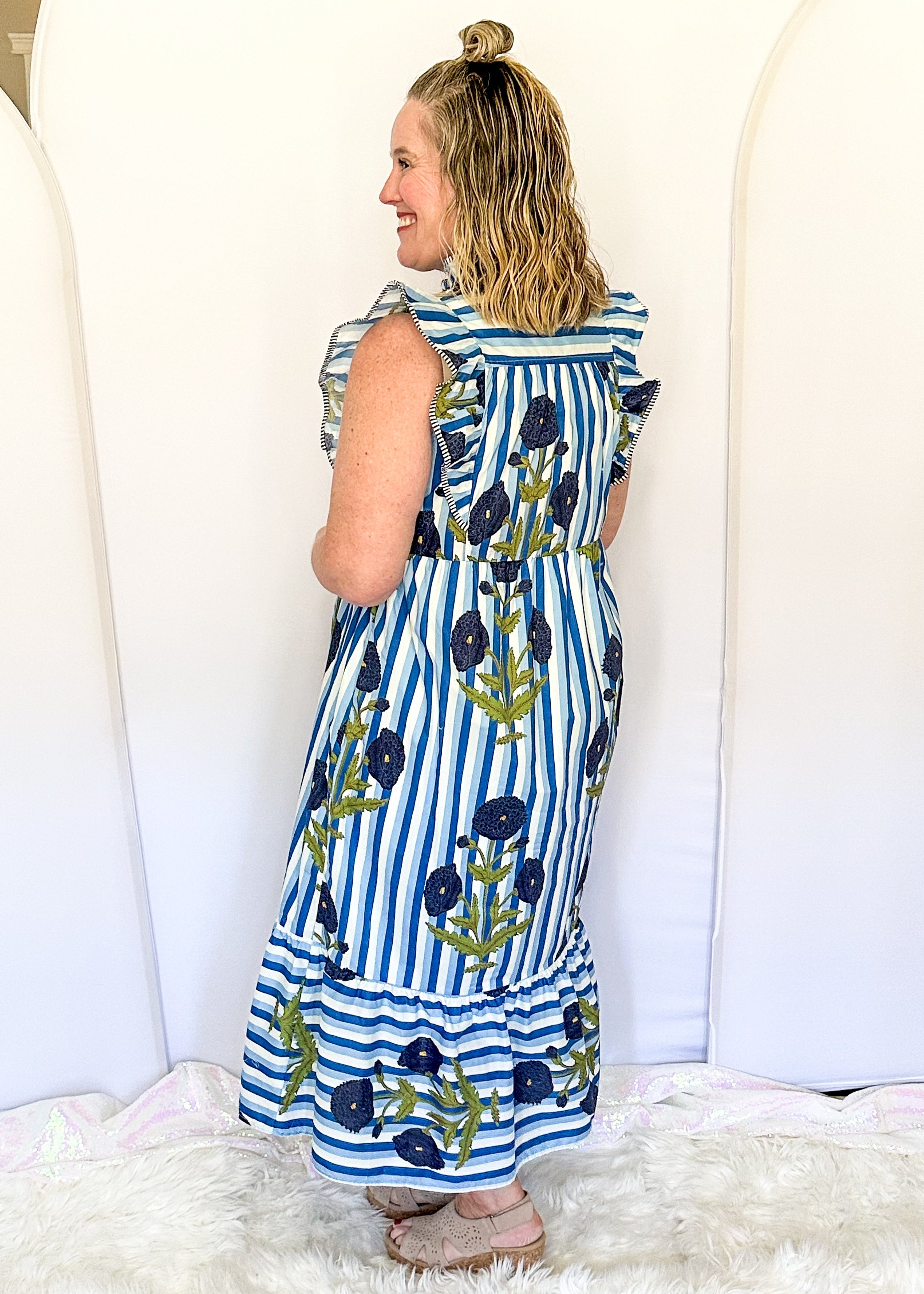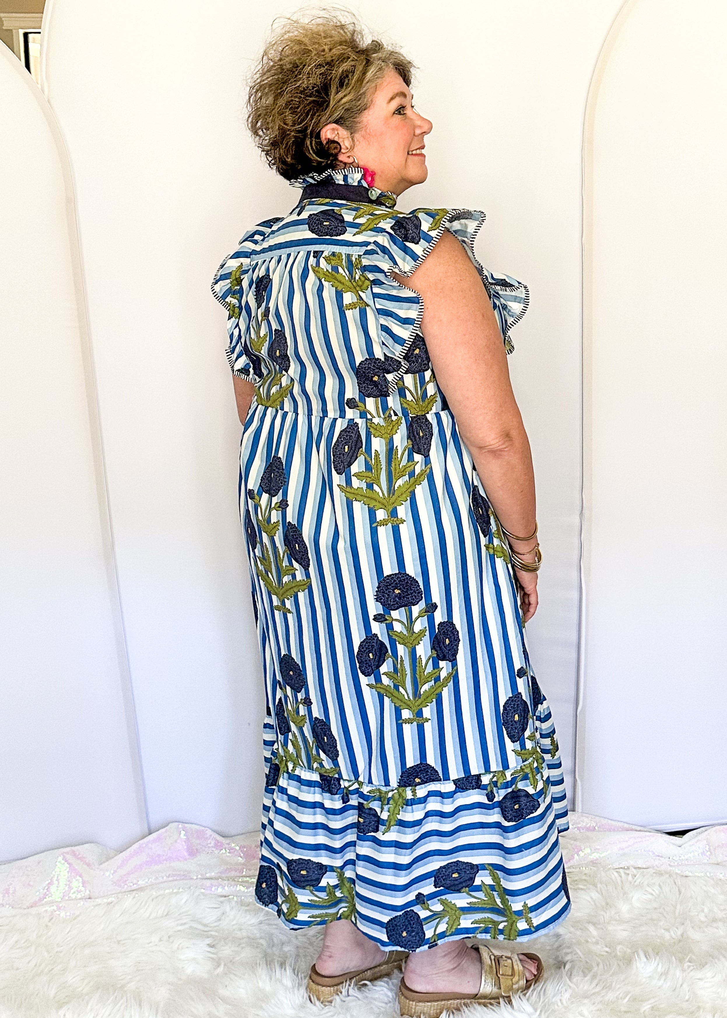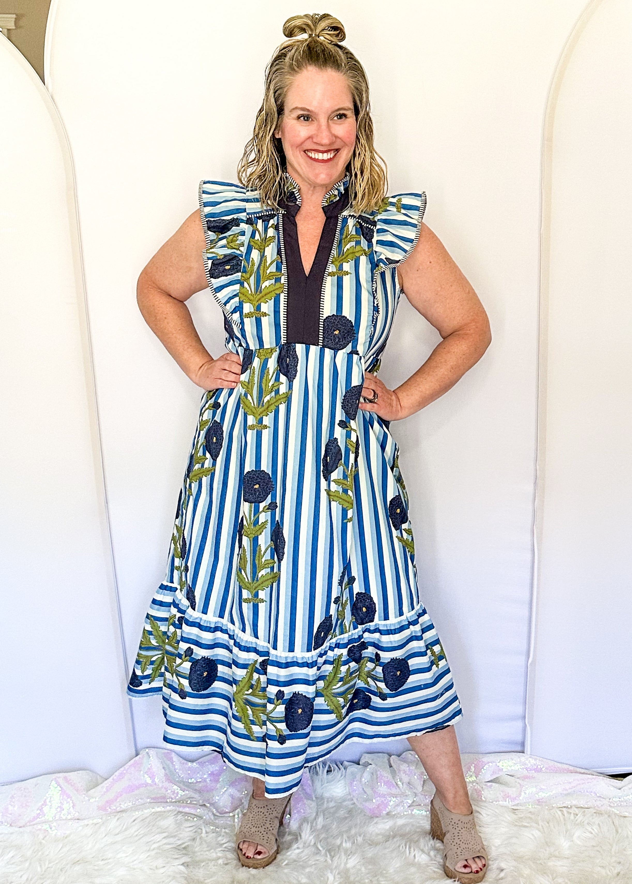 Fresh, fun, and impossible not to notice. This blue floral stripe midi dress features a flattering striped pattern, playful flutter sleeves, and a contrast V-neckline that pulls the whole look together. It’s lightweight, comfortable, and perfect for spring days when you want to feel cute, confident, and very much put together.