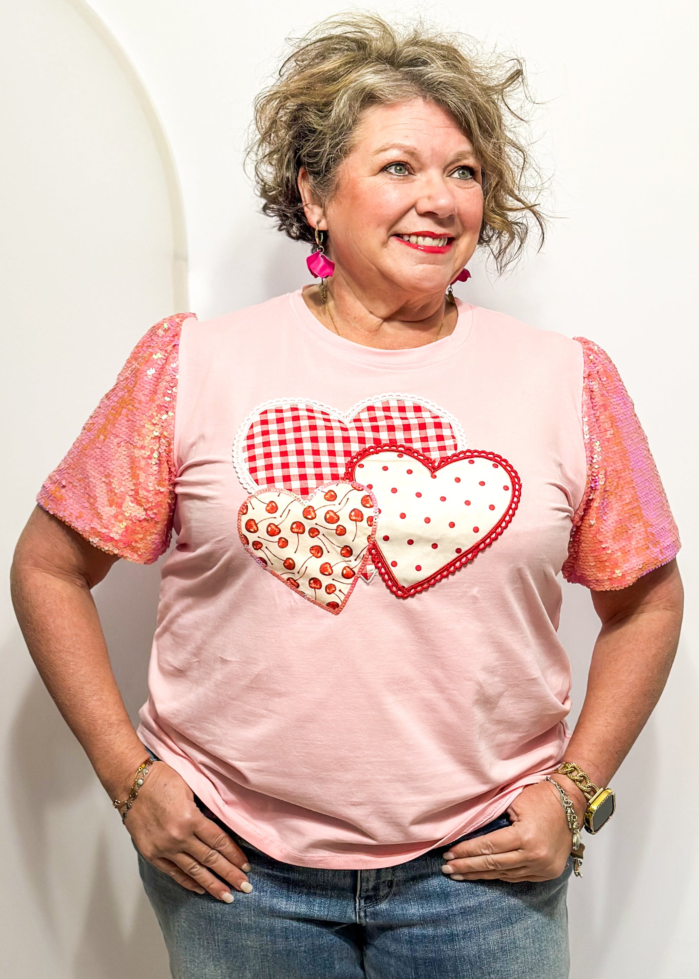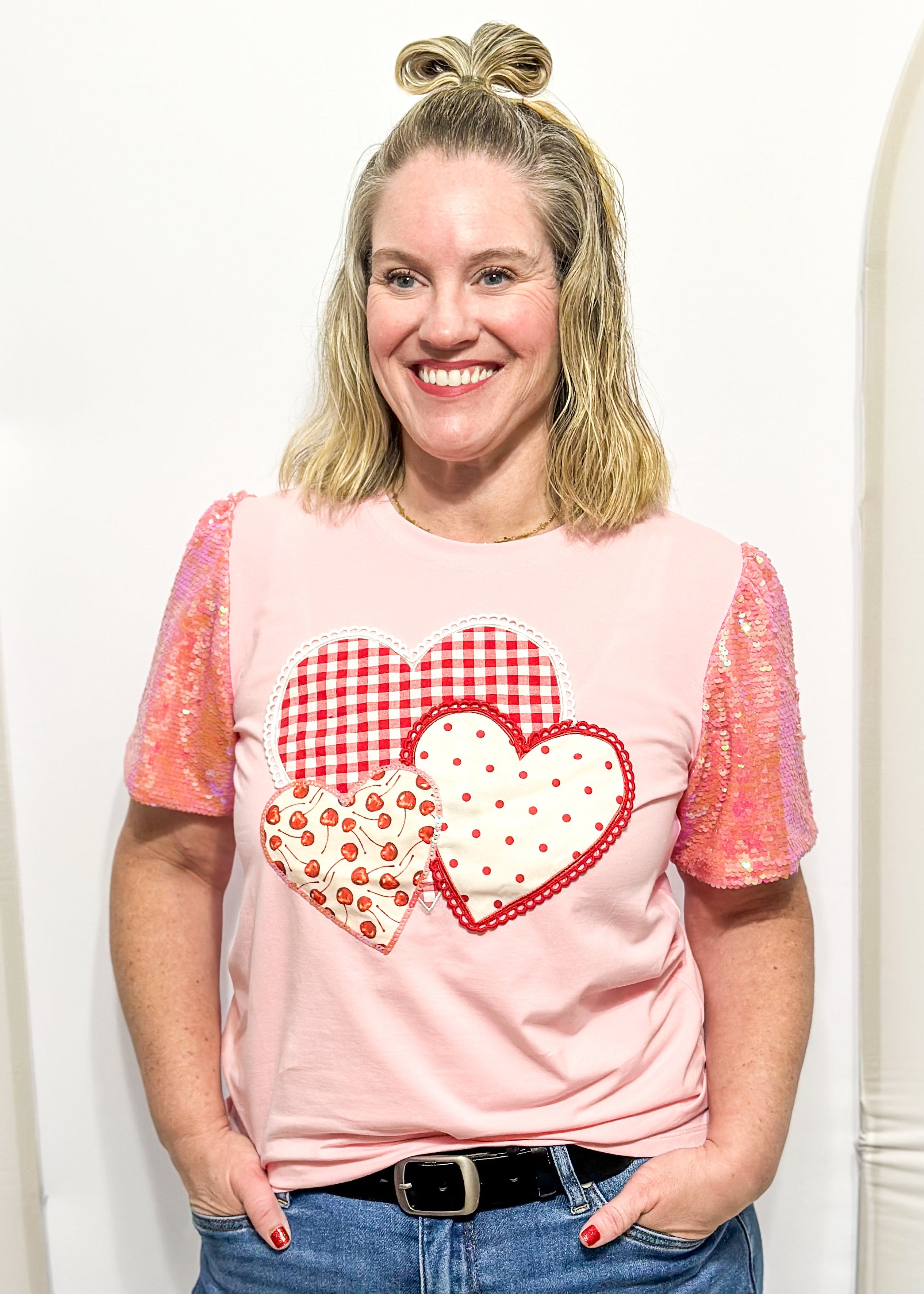 Because everyday life deserves a little sparkle and a whole lot of heart.  This soft pink tee features three adorable appliqué hearts in mixed prints and textures, while those puff sequin sleeves bring the shimmer in the most show-stopping way.