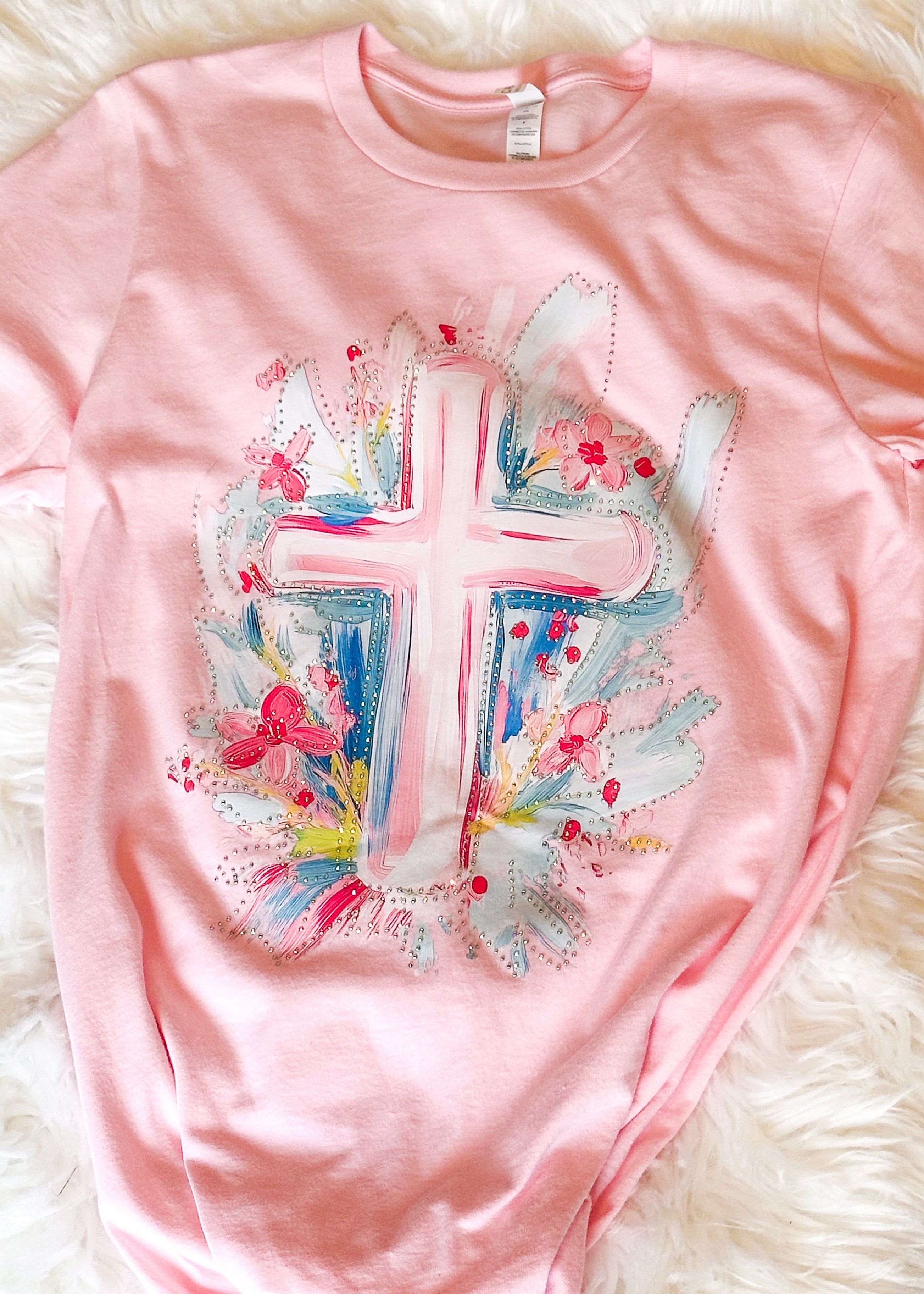 The watercolor cross design is finished with flat rhinestone accents for just the right touch of shine. Soft, comfortable, and easy to style — because you can absolutely keep your look casual and still make a statement.
