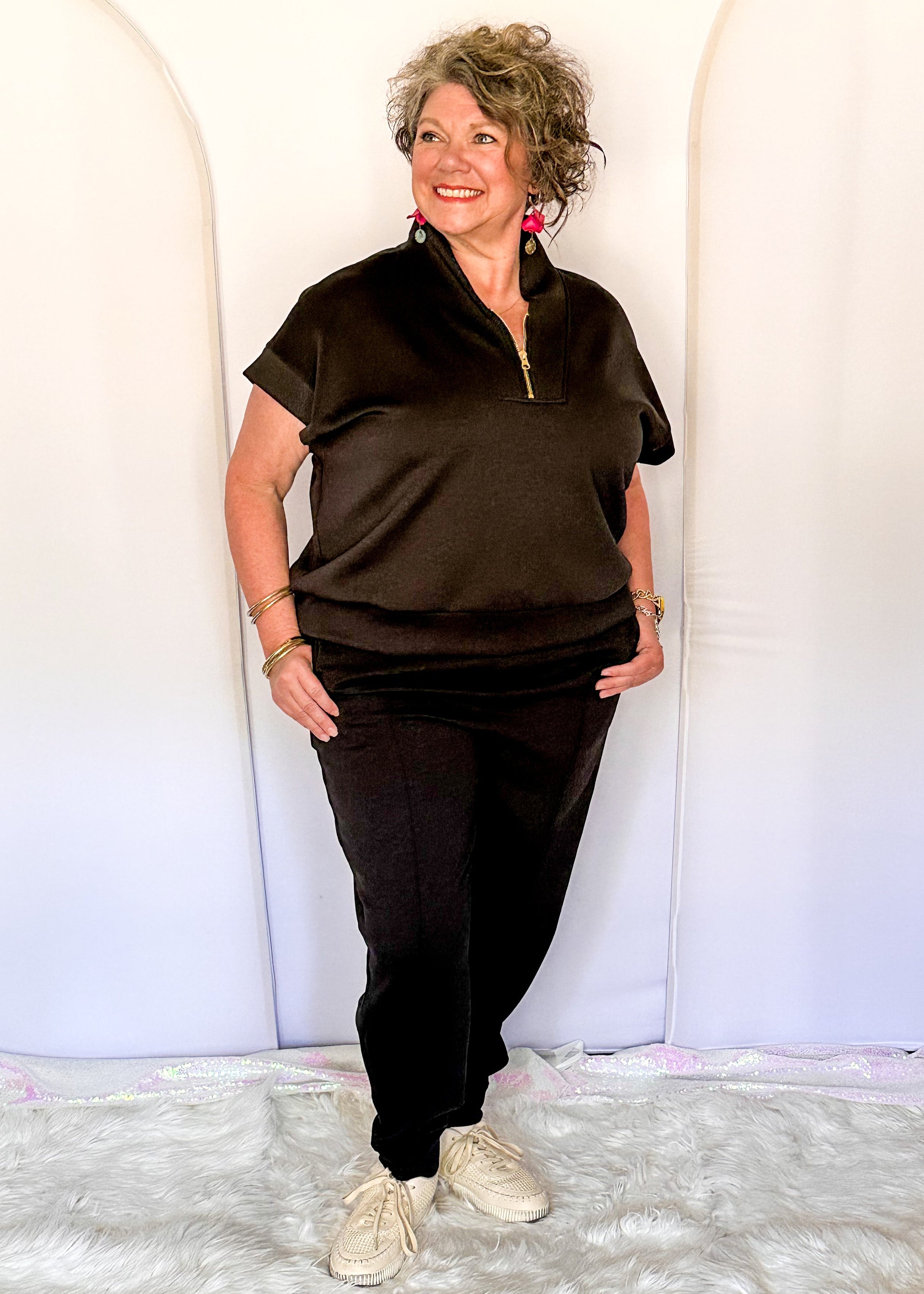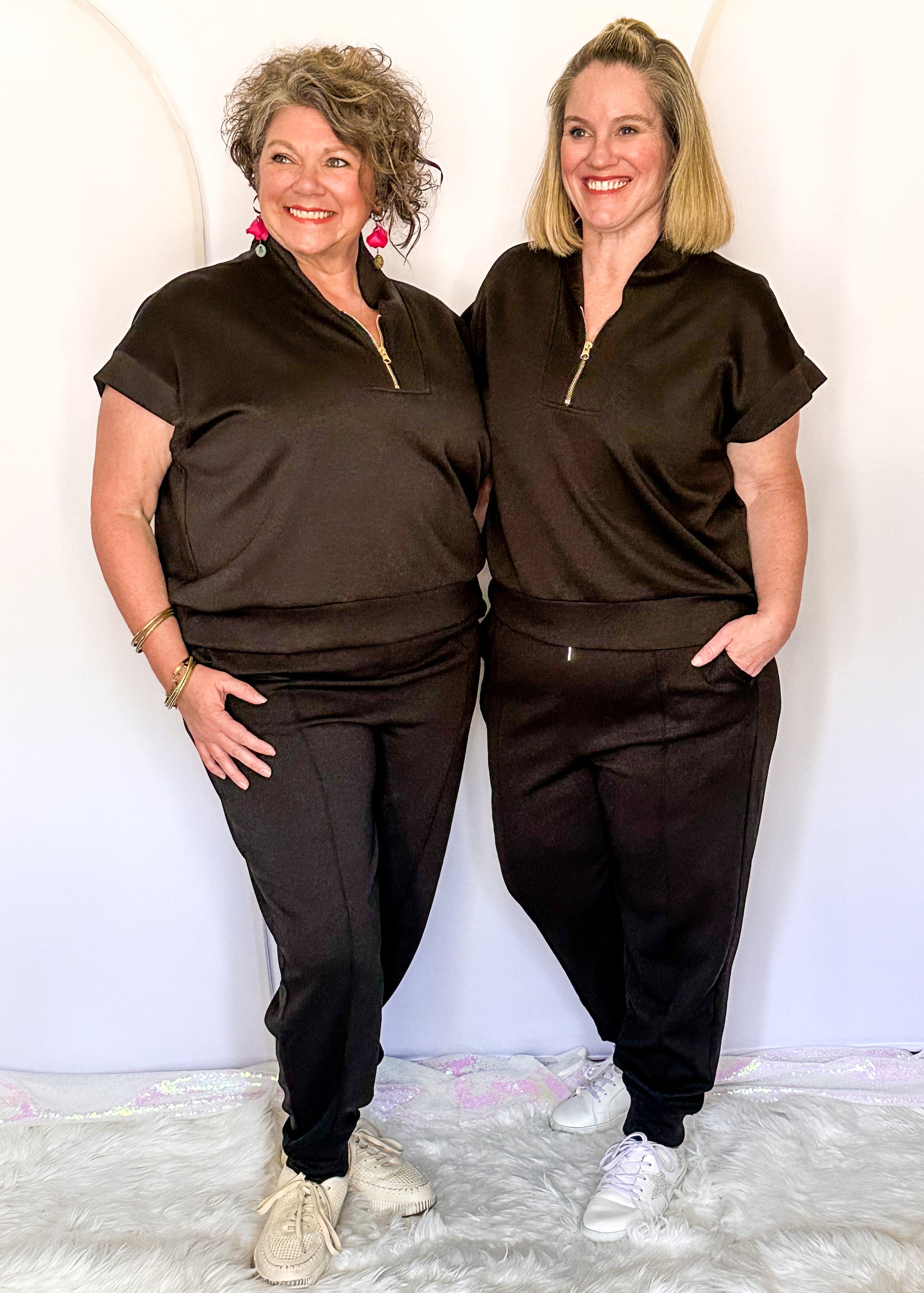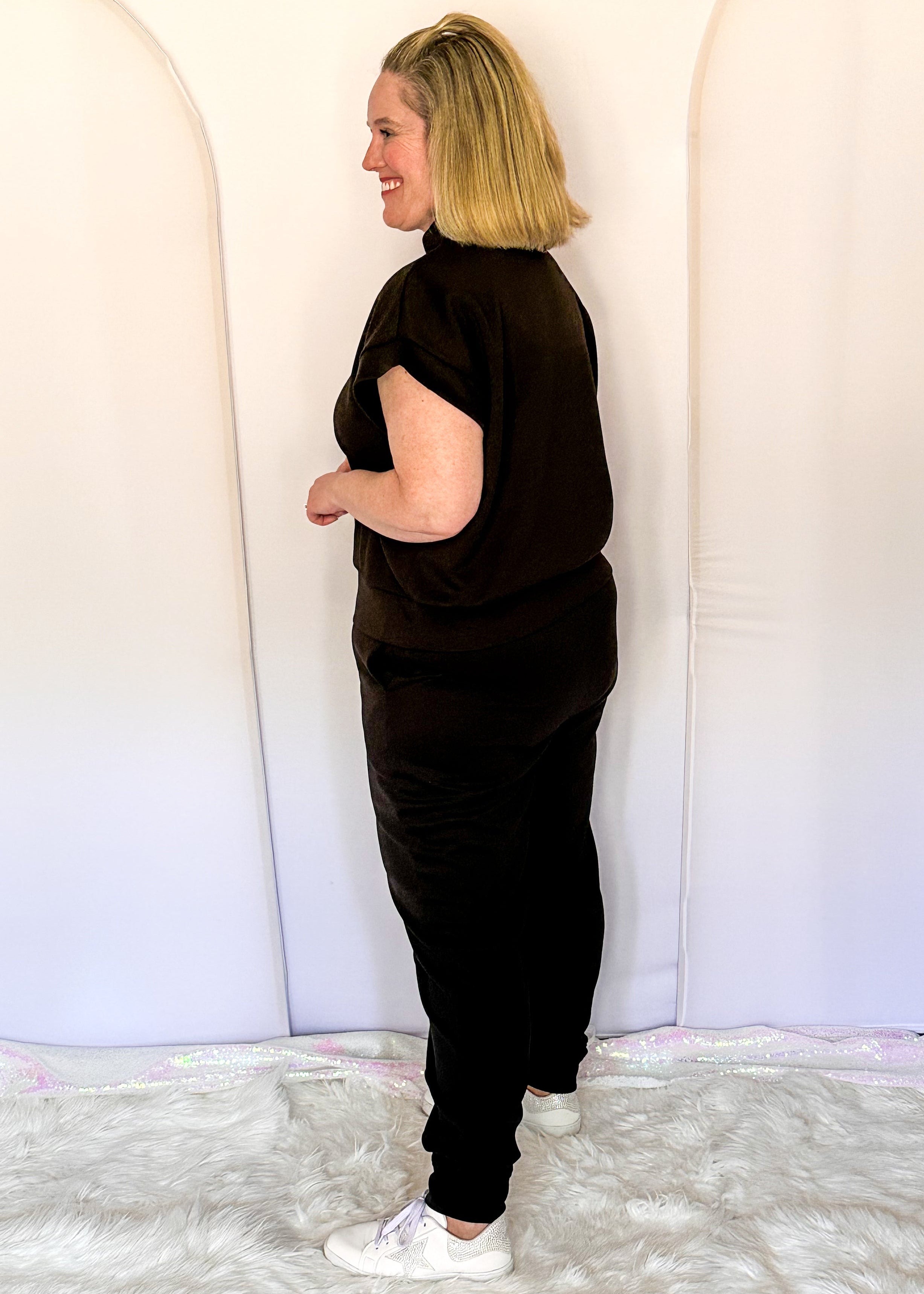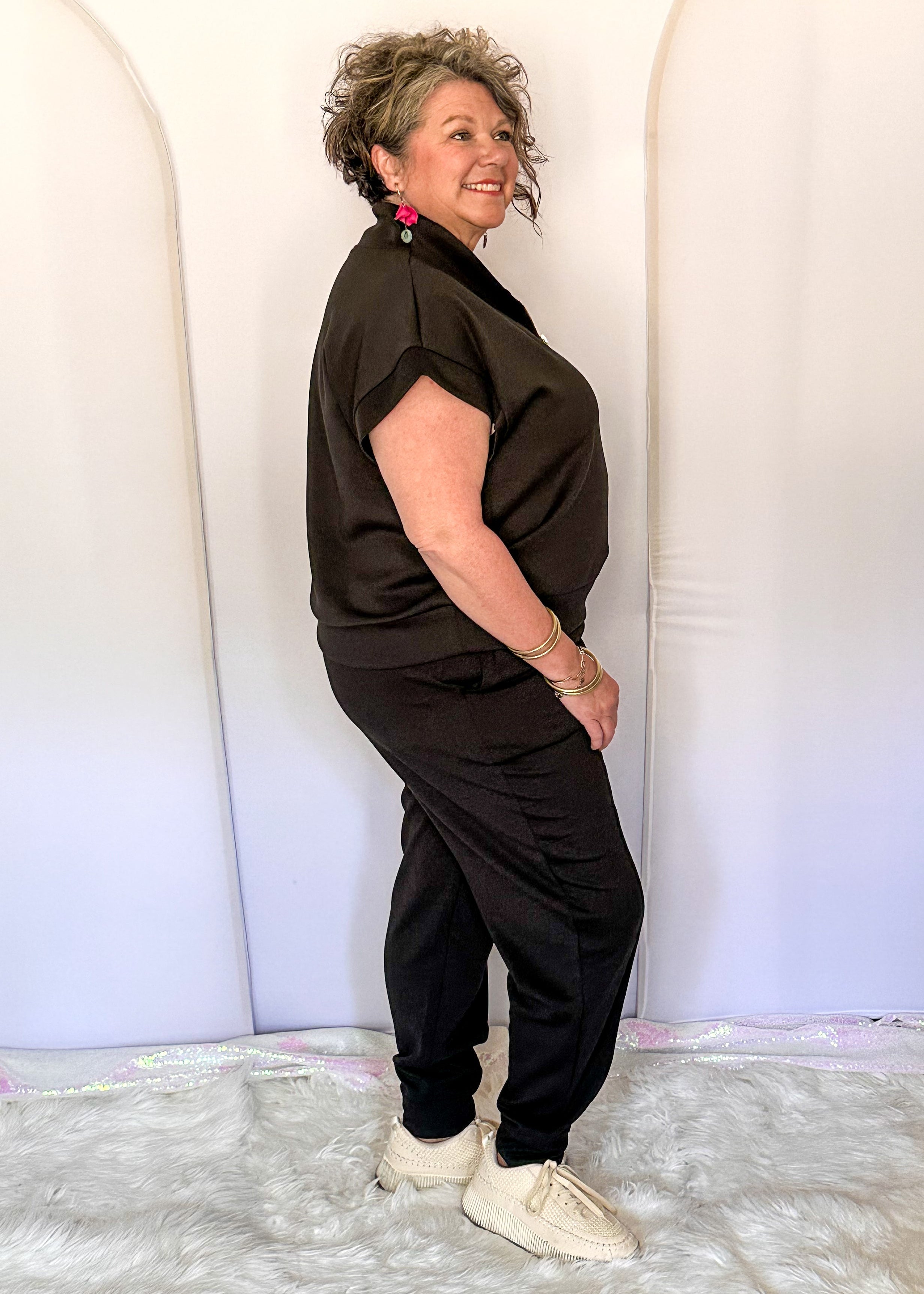 These black joggers are where comfort meets polished. Designed with a smooth, structured feel and a flattering tapered leg, they give you that put-together look without sacrificing stretch. The elastic waistband with drawstring keeps the fit adjustable and easy, while the clean silhouette makes them perfect for dressing up or down.