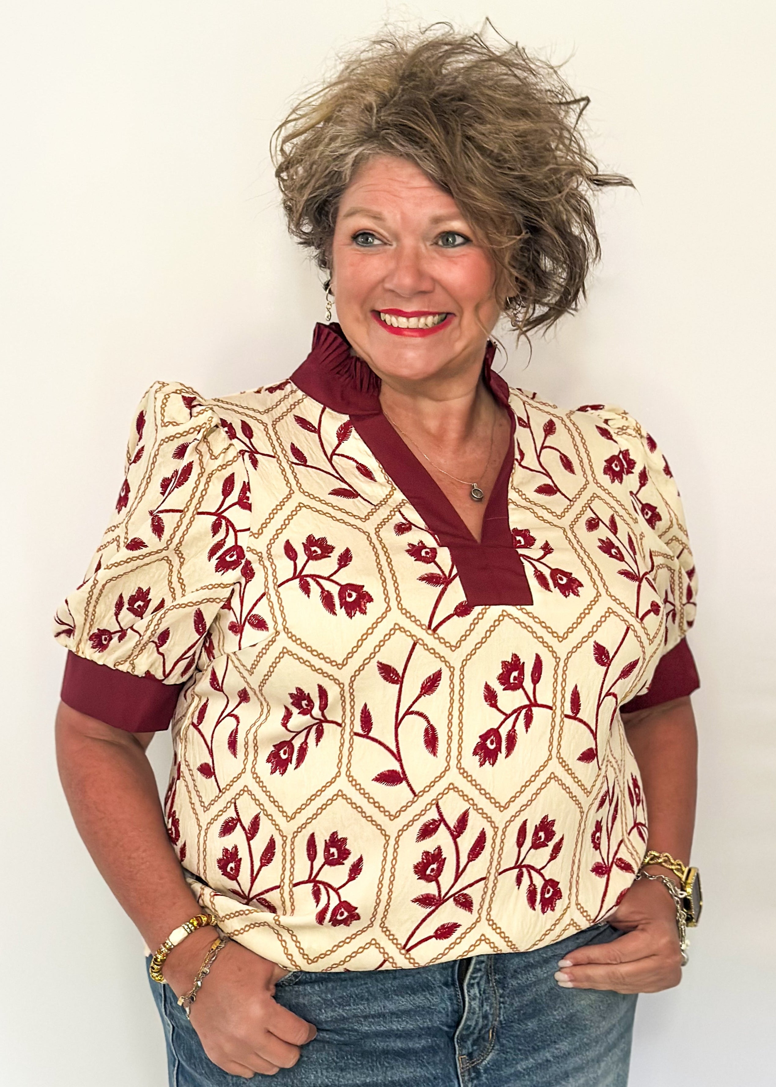 Vintage-inspired and fresh for today. This cream top is patterned with garnet red florals and honeycomb detailing, finished with garnet red trim and puff sleeves. Easy to pair, easy to wear, and always a standout.