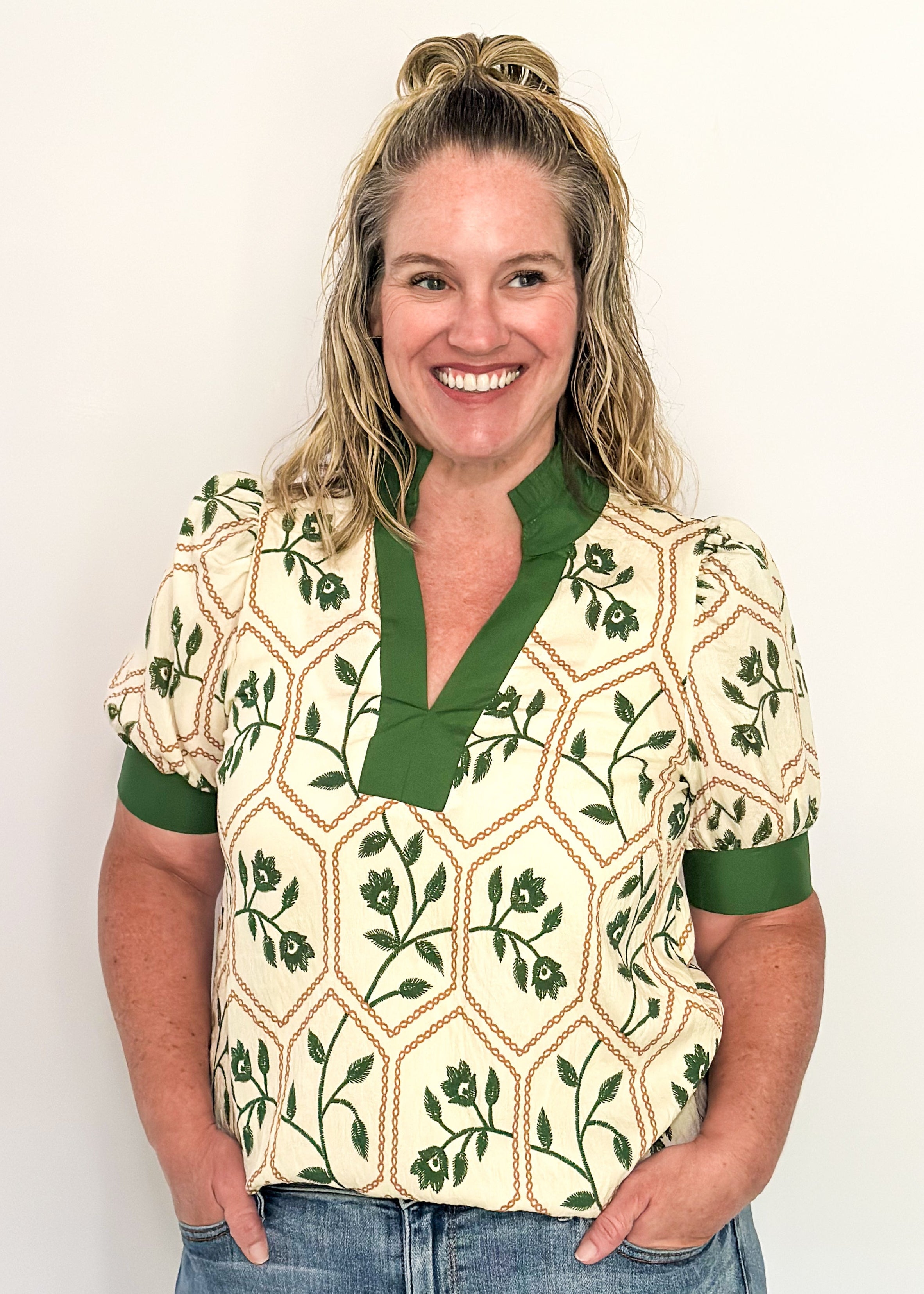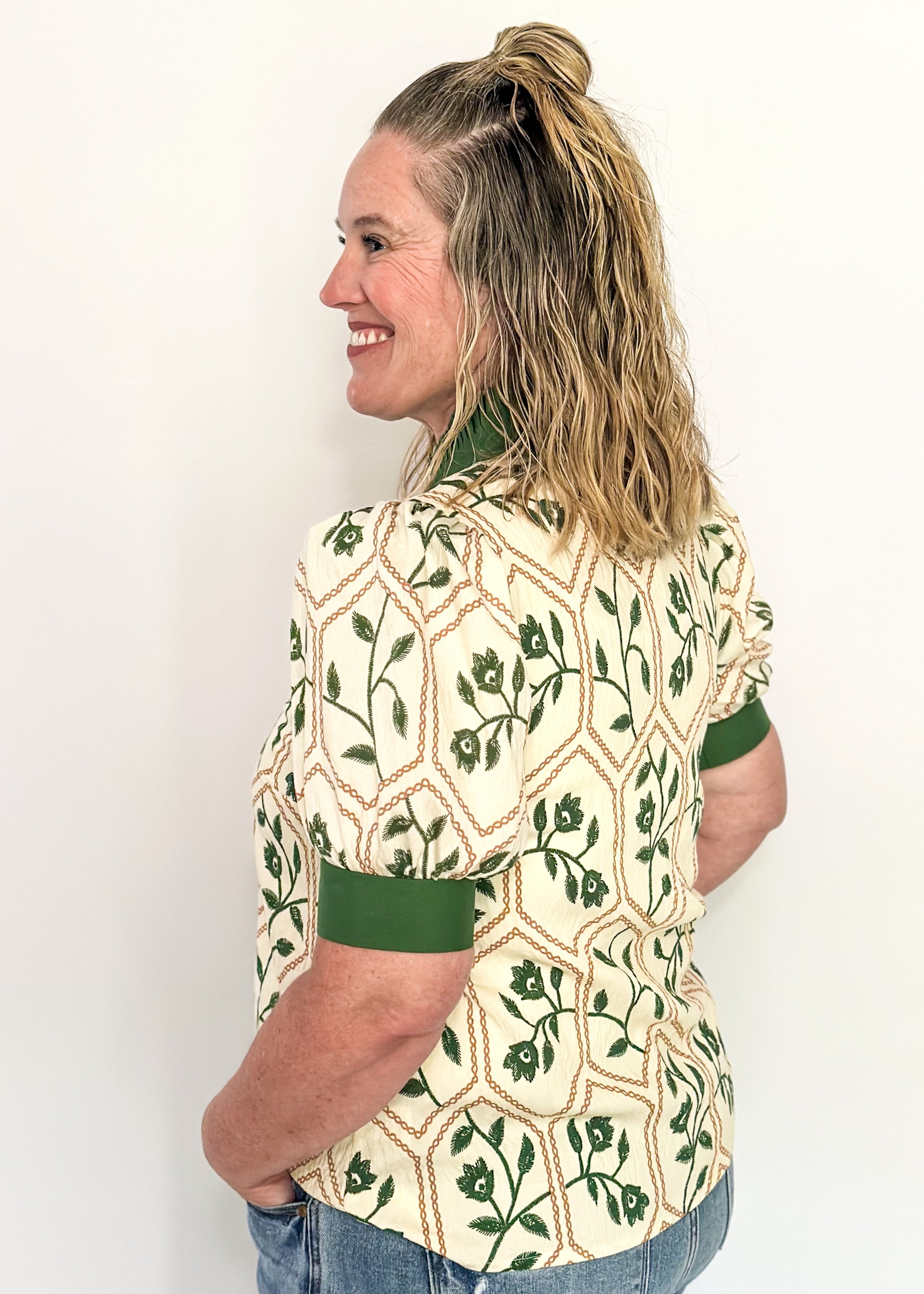 Vintage-inspired and fresh for today. This cream top is patterned with olive green florals and honeycomb detailing, finished with contrast green trim and puff sleeves. Easy to pair, easy to wear, and always a standout.