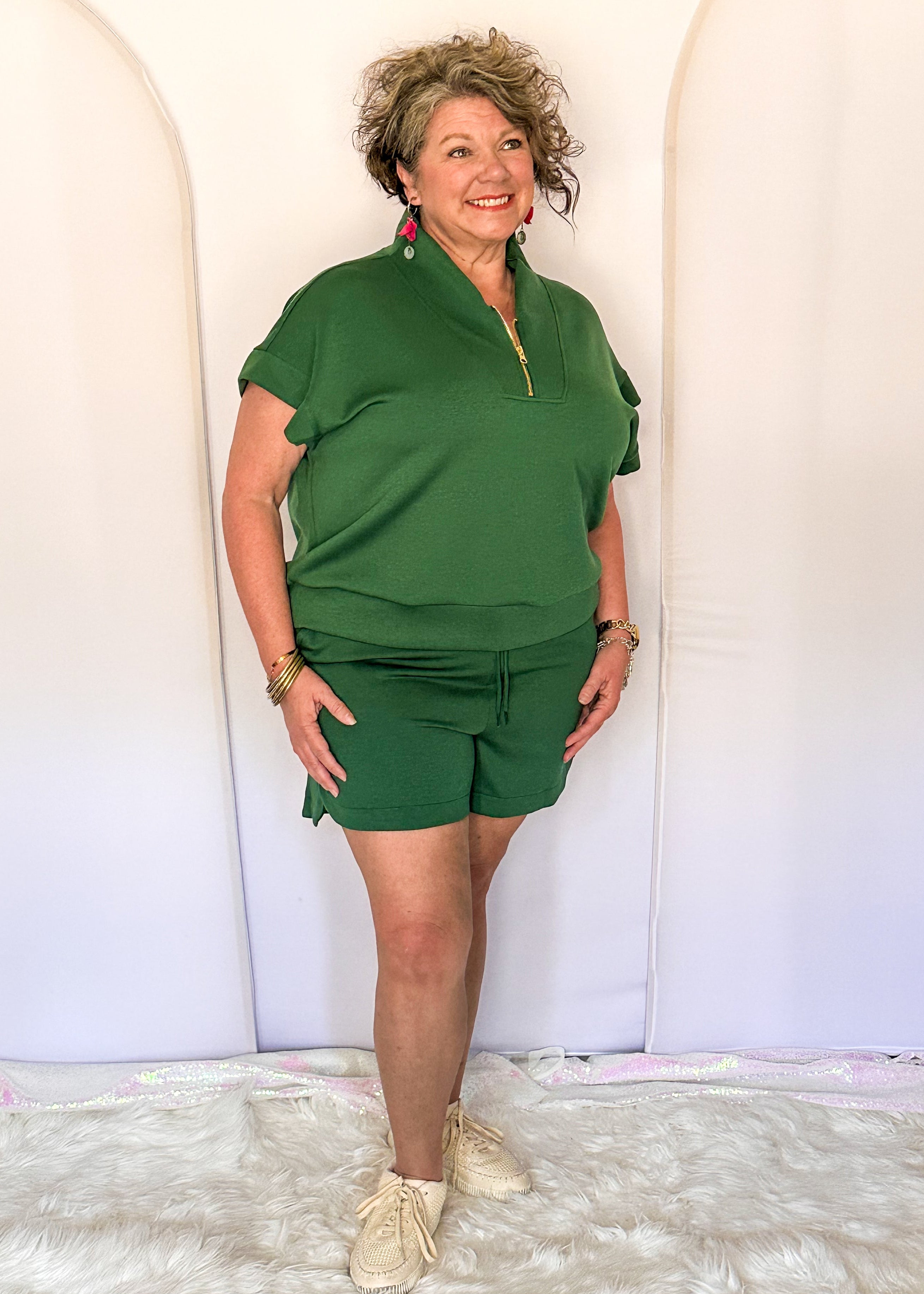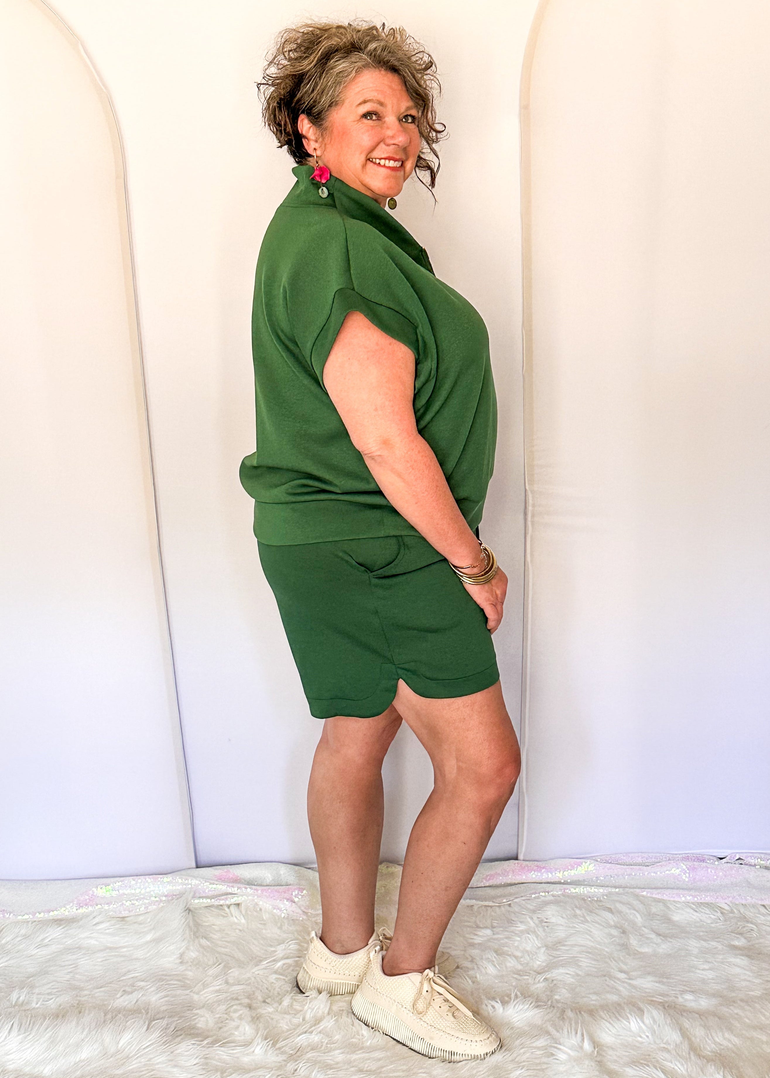 If you love a comfortable short that still looks intentional, this is it. The smooth butter soft material creates a flattering drape, and the elastic waist makes them easy to wear all day long. Clean, simple, and quietly confident.