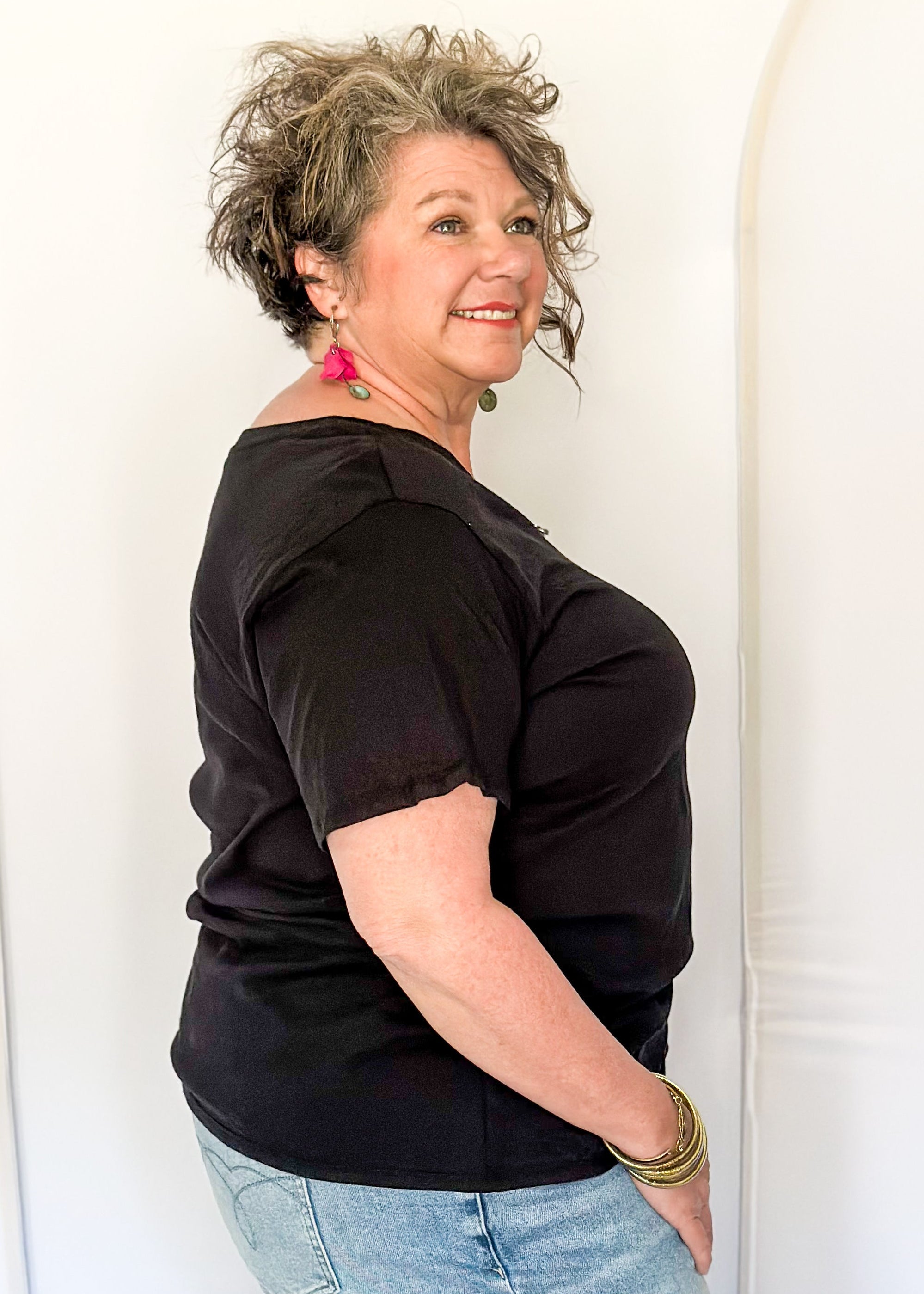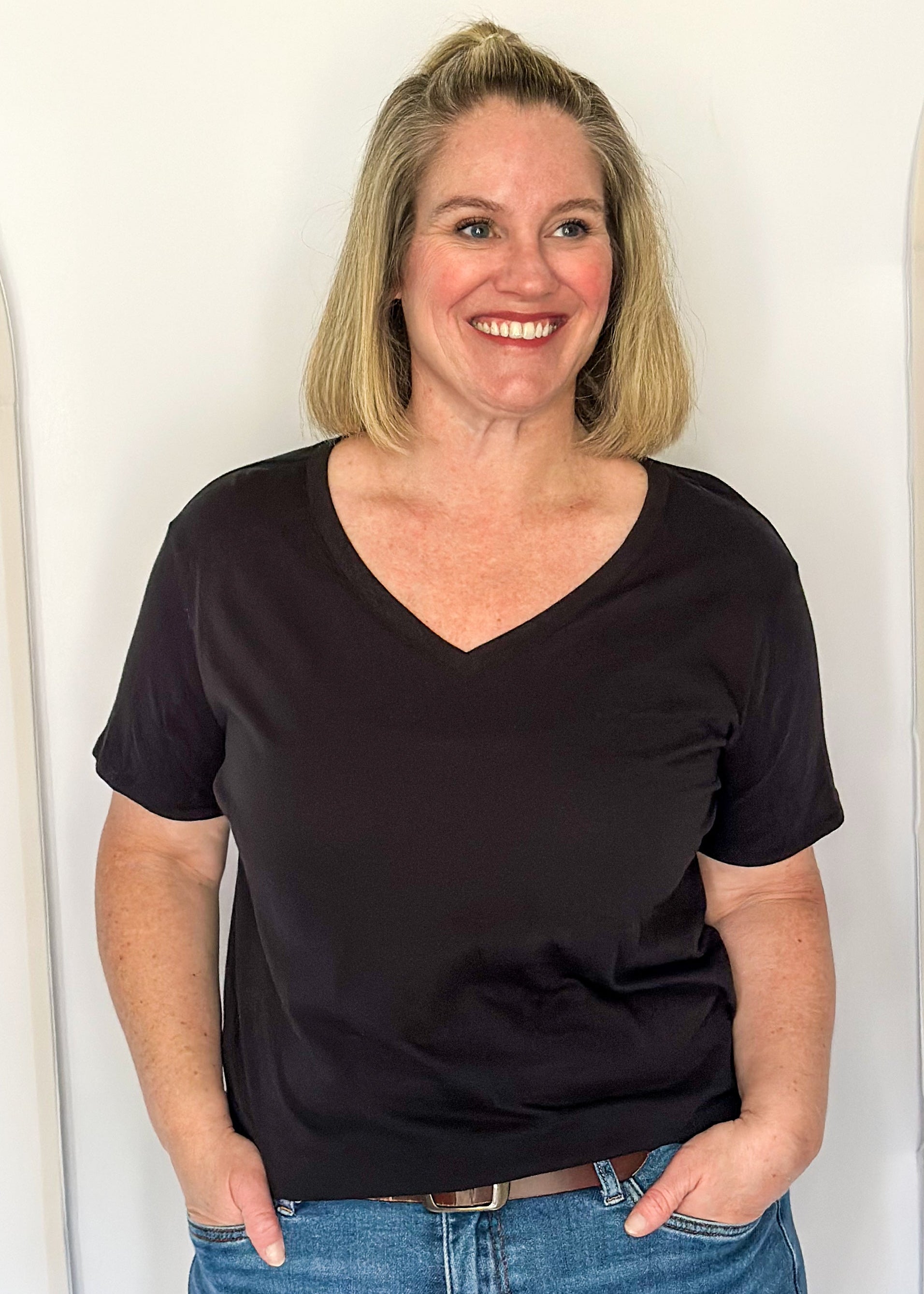 This is the kind of tee you grab once… and then realize you should’ve bought it in every color. Flattering v-neck, easy relaxed fit, and soft enough to wear all day without thinking about it.